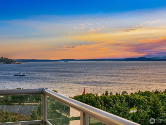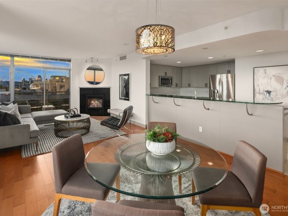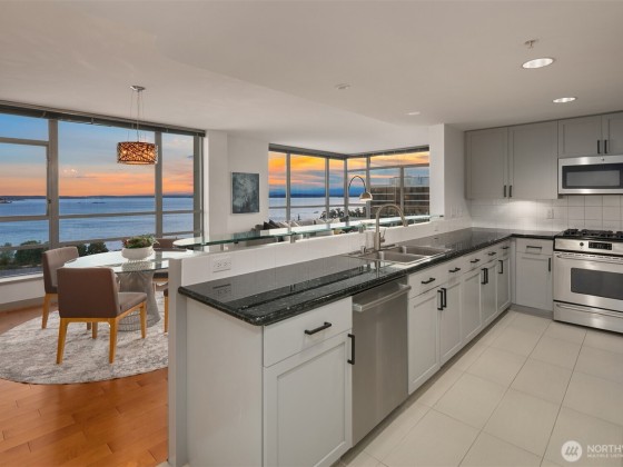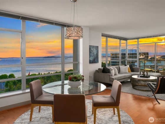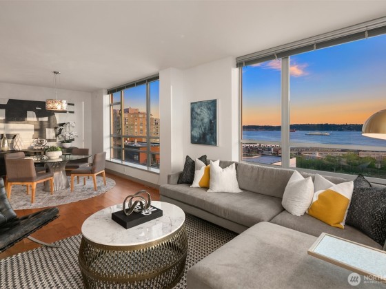 Commanding panorama of Elliott Bay + Olympics highlight this sophisticated 2BR Belltown corner condo with 2 secured parking spaces. Natural light cascades thru floor-to-ceiling windows which dramatically frame views of sunsets, ferries + Sculpture Park. Open floor plan offers optimal modern living with great entertainment potential. Bright LR features distinctive FP, chic hardwoods + access to deck. Proseries stainless appliances and slab granite counters help define modern kitchen. Stunning glass breakfast bar adds style & function. Expansive vistas also found in spacious bedrooms with owner’s BR including ensuite + California closet. Elevate your lifestyle in one of city’s hippest neighborhoods with dining, parks + nightlife just outside.