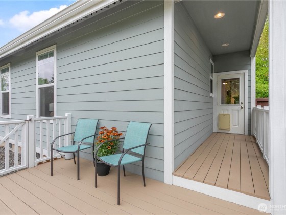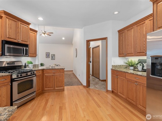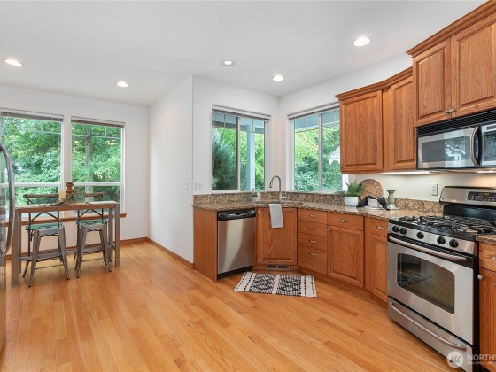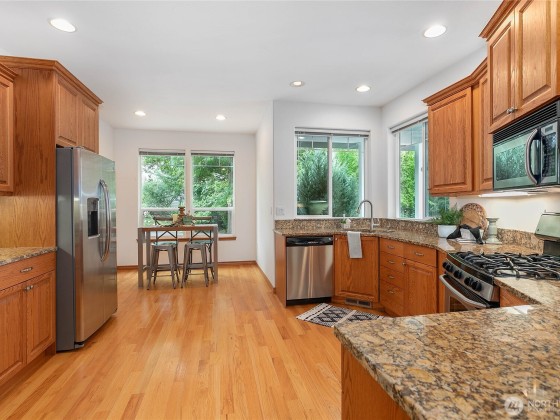 Sparkling & modern stairless home waits on the edge of the Palisades neighborhood, right on the trail. Open plan features vaulted ceilings, generous stone breakfast bar and stainless appliances in the south-facing eat-in kitchen. Large primary suite w/ walk-in closet. Lots of (real) hardwood floors and oak cabinetry throughout, lending a warm interior. Walk-in pantry/utility space, attached 2-car garage and private composite deck with your own berry patch! Low-maintenance yard on a zero-traffic Cordata lane, conveniently located to medical, transit, Trader Joe's and the community college-- right at the other end of the trail.