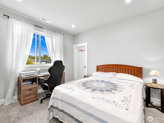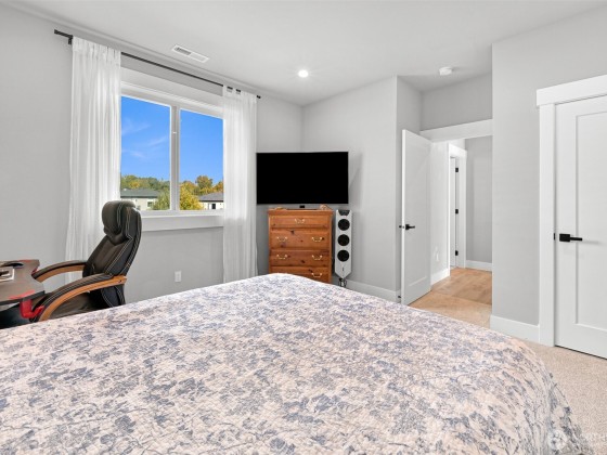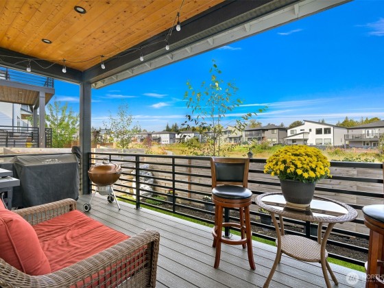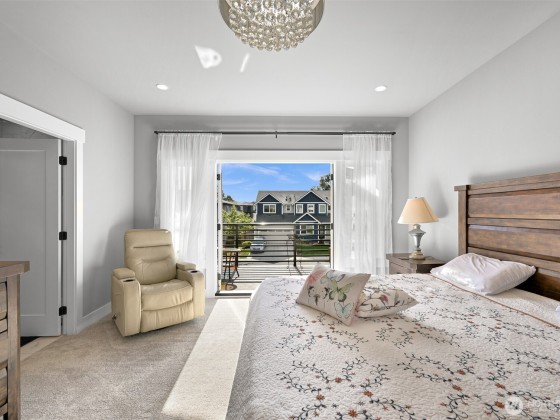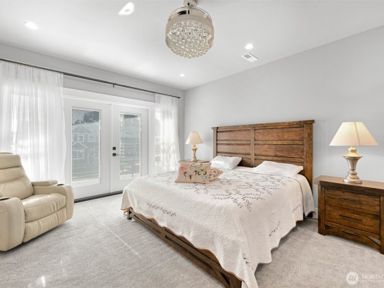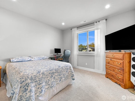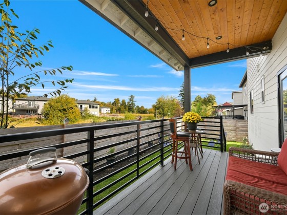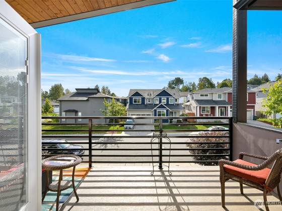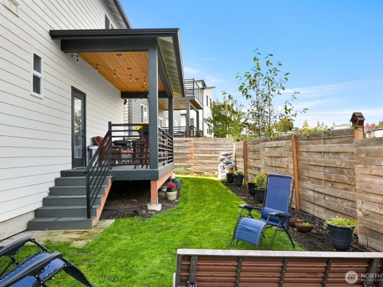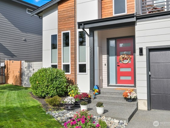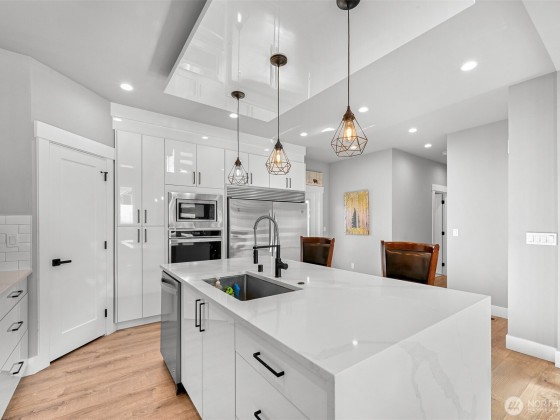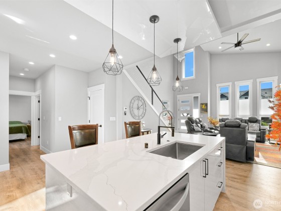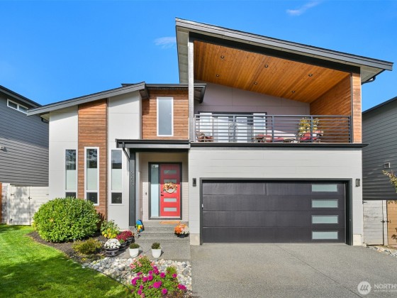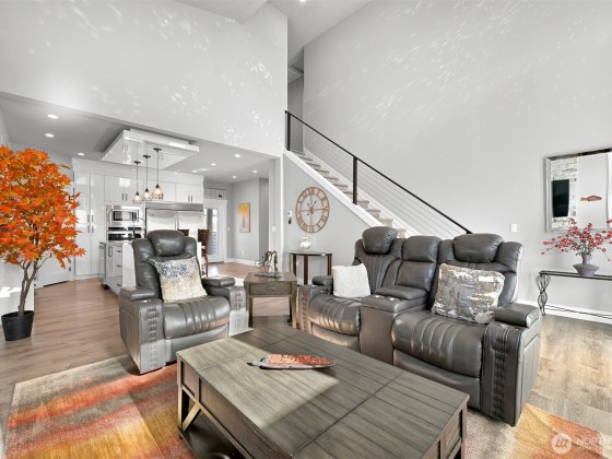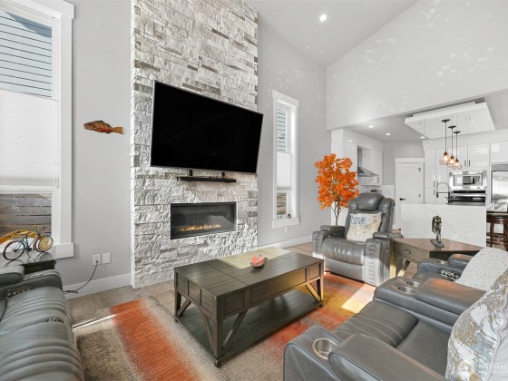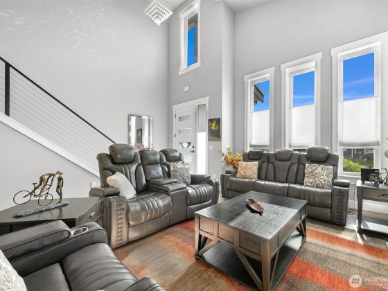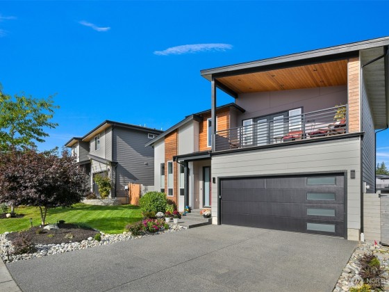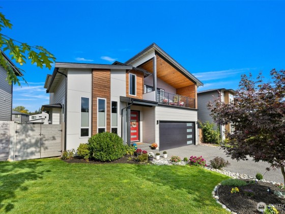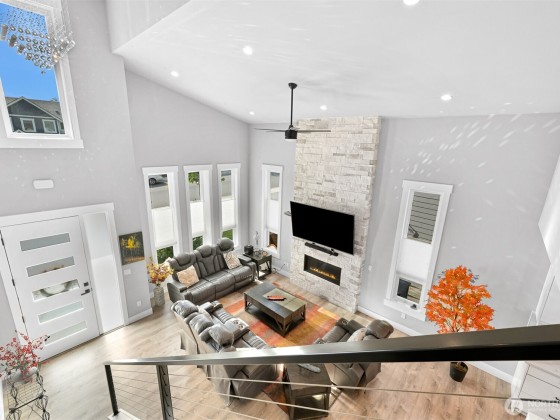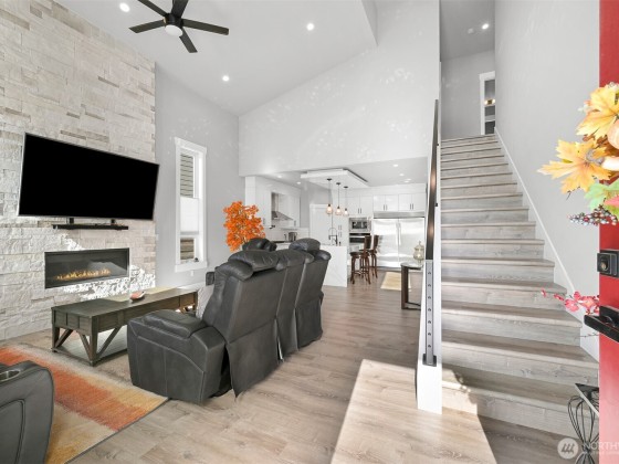 One of Ferndale's modern elegance in desirable Malloy Terrace. This open and spacious 4-bedroom home welcomes you with soaring 19 ft ceilings in the living room anchored by a gorgeous floor-to-ceiling rock wall fireplace. Chef's kitchen features sleek waterfall quartz counters, a walk-in pantry, & double fridge. One bedroom on main sits adjacent to a full bathroom. The primary suite upstairs offers a walk-in closet, bathroom w/ double vanity + step-in shower, and French doors that lead to its own covered deck. Fully fenced yard backs to the community greenspace & trail. Close to Vista Ridge Park & Cedar Creek Park plus easy access to I-5 via Thornton Overpass. Come and see this gem!