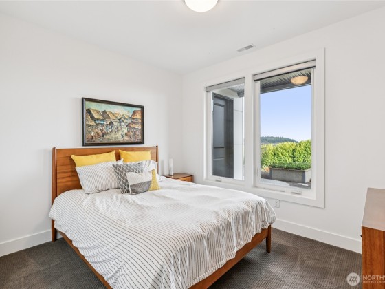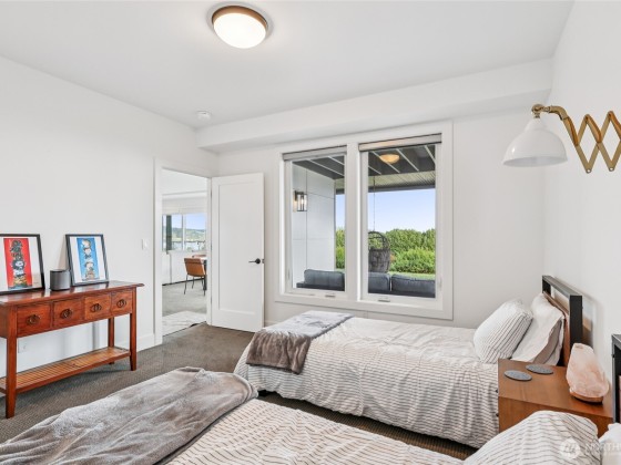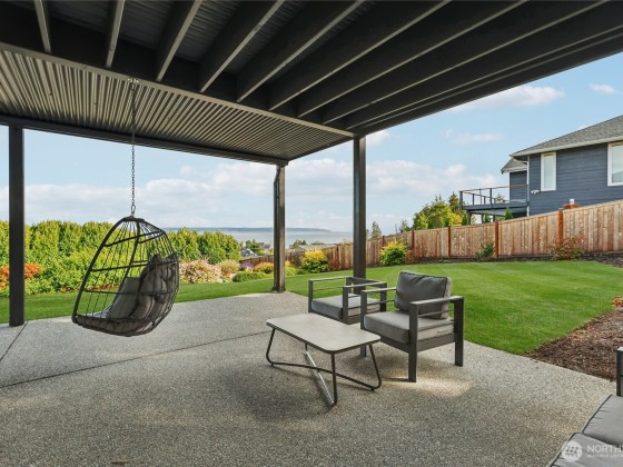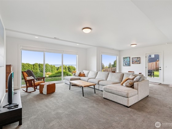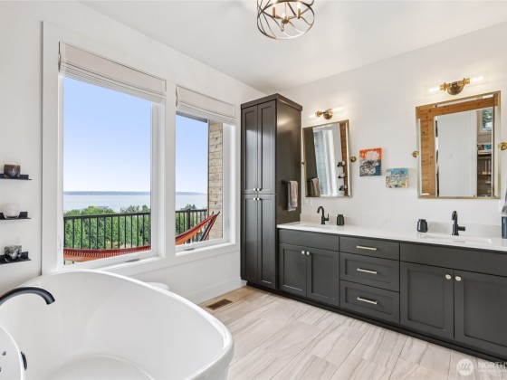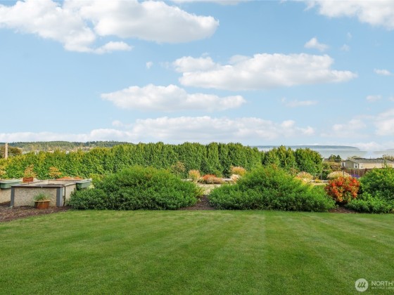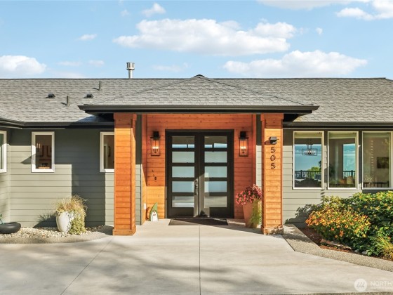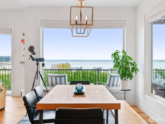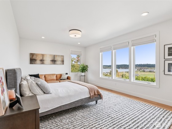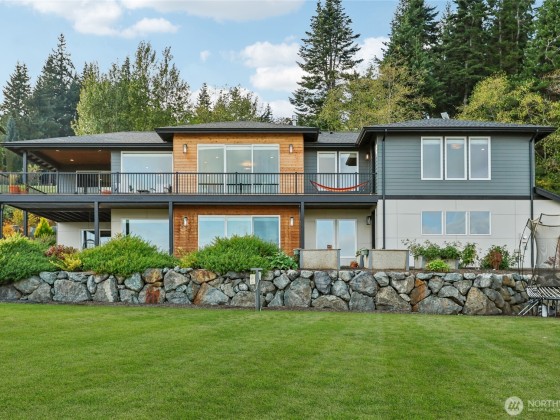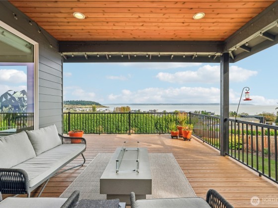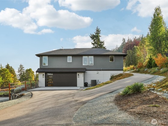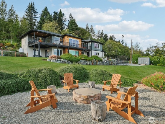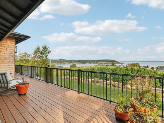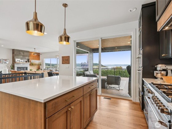 Experience private Camano Island living with sweeping bay, mountain, and territorial views. Ideally located, offering easy access to parks, beaches, and shopping. Main floor living offers custom cabinetry throughout, warm hardwood floors, and chef’s kitchen with double ovens and elegant finishes. Enjoy Northwest outdoor living year-round on the covered view deck. The primary suite captures views from every angle and features a large walk-in closet, en suite bath with a soaking tub, an oversized shower, and private deck access. Lots of space to entertain either floor! Two garages (one on each level) + a 300+sqft flex room w/space for gym, studio, or storage. Generator wiring and EV charging make this home as functional as it is beautiful.