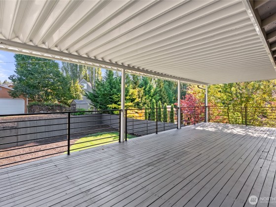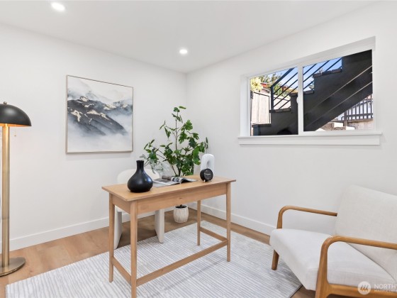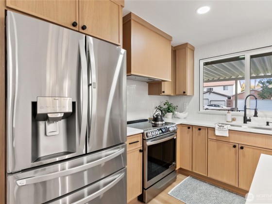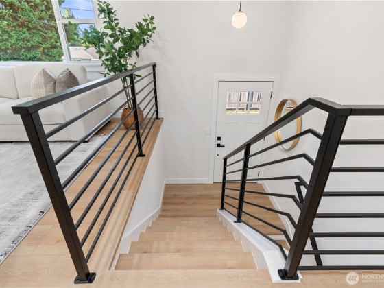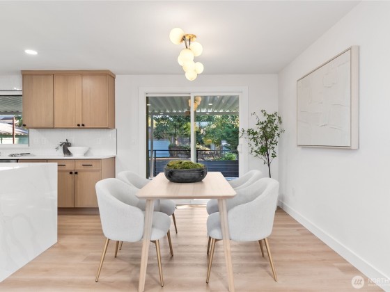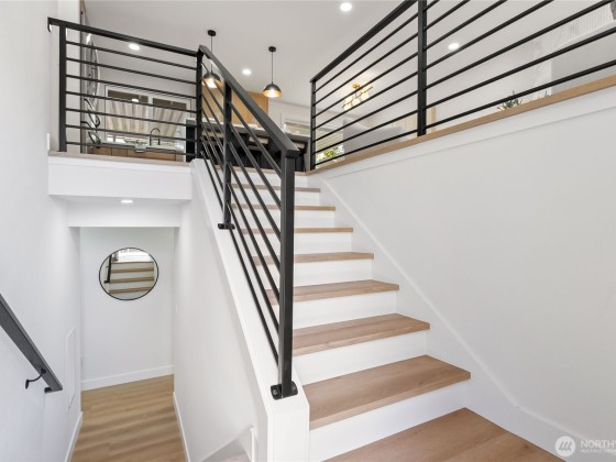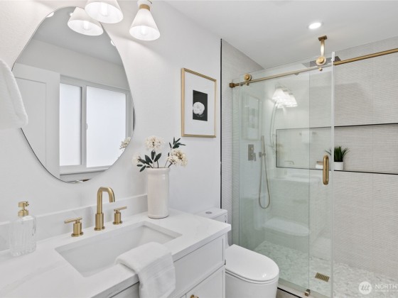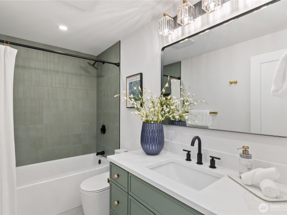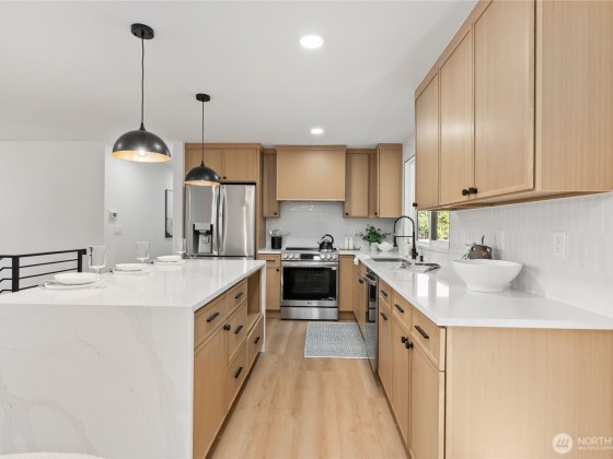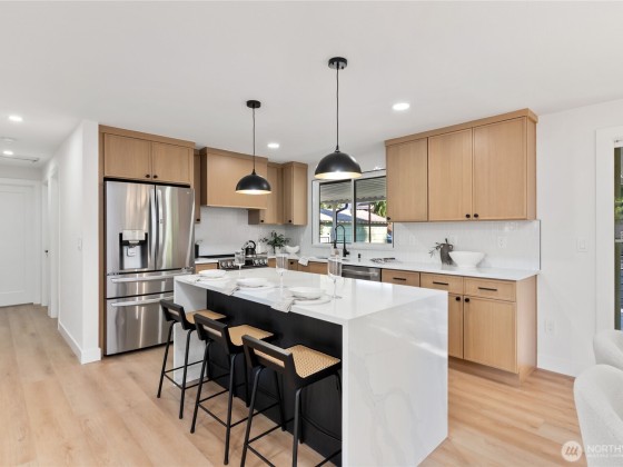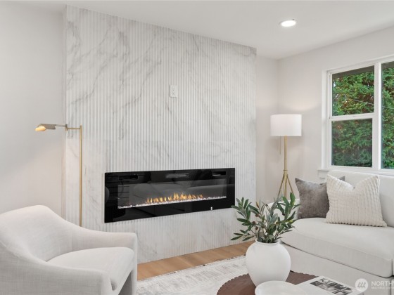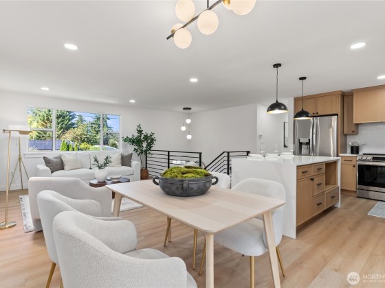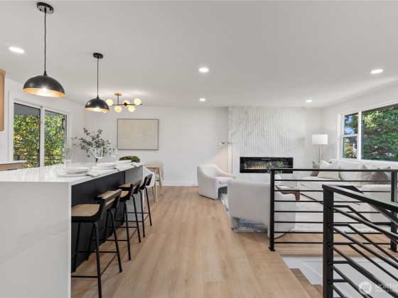 Stunning Greenwood Home!This beautifully remodeled 4-bedroom,2.75-bath home blends modern design w/comfort &efficiency.The open-concept layout features new LVP flooring,sleek metal railings,&an electric fireplace w/ elegant custom tile work.The all-new kitchen shines w/quartz countertops,a waterfall island,&SS appliances—ideal for entertaining.The primary suite offers a walk-in closet&a luxurious bath w/ a custom tile shower.An additional finished room provides flexible space for an office,gym,or guest area.Energy-saving solar panels,a new furnace,&a new water heater ensure peace of mind.Outdoors, enjoy the new sod,expansive 12x30 covered deck,&10x15 covered storage.Conveniently located near shopping,light rail,city, Sound,&the greater PNW!