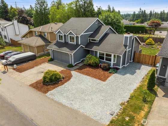 Welcome to this beautifully maintained tri-level home in the desirable Cherokee Bay community! Tucked in a quiet neighborhood, this 3-bedroom gem features vaulted ceilings, a cozy fireplace, and natural light throughout. Enjoy the updated kitchen, spacious layout, and a large fenced backyard perfect for entertaining—complete with a mountain view and double-gated RV parking. Downstairs offers a dedicated office and bonus room, ideal for guests or hobbies. Solar panels (2019, paid off), roof, and windows (2019) provide efficiency and peace of mind. Community perks include private lake access, clubhouse, park, and sport courts—all within the Tahoma School District! This home has it all!!