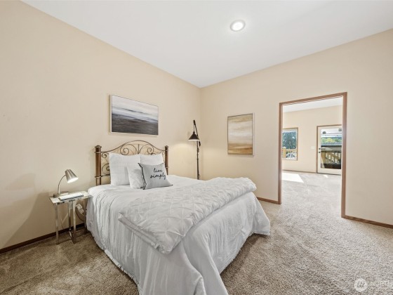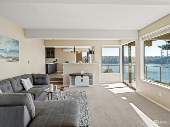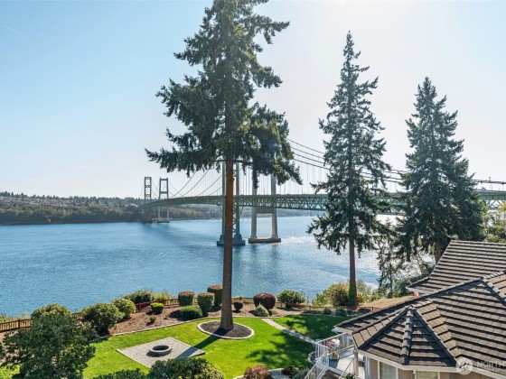 Extraordinary high-bank waterfront condominium in the coveted Narrows View community, featuring breathtaking views of Puget Sound and Mt. Rainier. This gated enclave offers a unique blend of tranquility, luxury, and convenience. A ground-floor unit offering effortless living, A/C, a new updated kitchen, spacious living room with walls of windows and private deck showcasing unobstructed water views and the iconic Narrows Bridge, 2nd bedroom and another full bath. The lower level features a 3rd bedroom/office suite with separate entrance and 2nd view deck, storage room, huge bonus room and 2-car garage accessed from inside the home. Quick access to charming Gig Harbor, medical care, shops, boutiques, and restaurants, I-5 and Sea-Tac Airport.