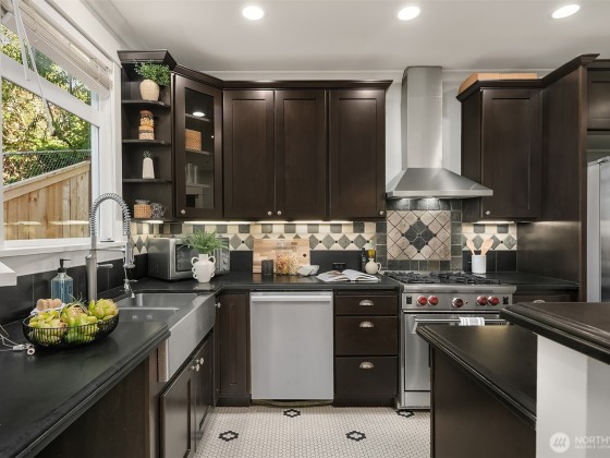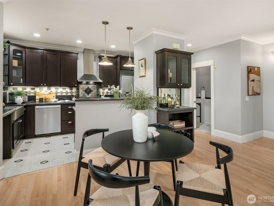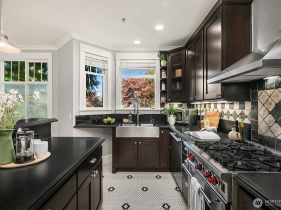 Sophisticated Capitol Hill townhome, where classic meets contemporary. Freshly refinished gleaming maple hardwood floors, radiant in-floor heating, and fresh paint welcome you. The chef's kitchen offers sleek granite surfaces, a high-end Wolf range, and generous pantry space. Escape to the primary retreat, with soaring vaulted ceilings, two generous walk-in closets, a serene spa bath, and a secluded office alcove. Savor panoramic city vistas from the rooftop deck, or unwind on the balcony and rear patio. Rare two-car garage and bonus storage. Mere blocks to Volunteer Park, a quick stroll to lively 15th and Broadway dining and boutiques, plus seamless light rail and highway connections. Walk Score 97—effortless city living redefined.