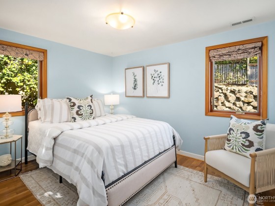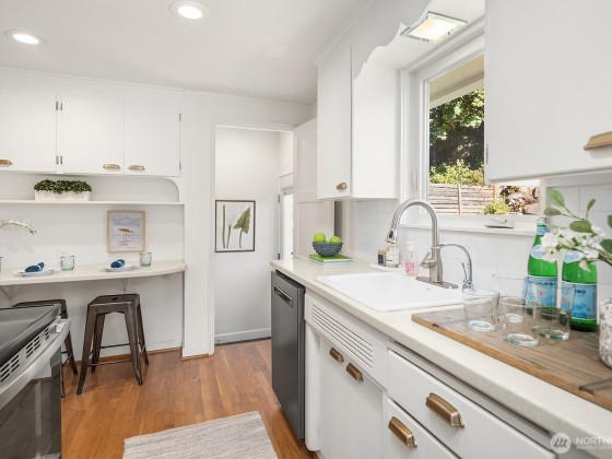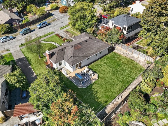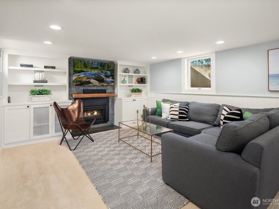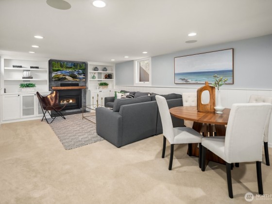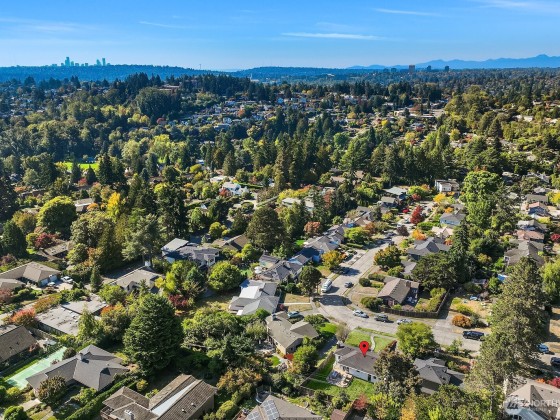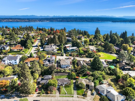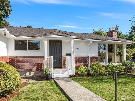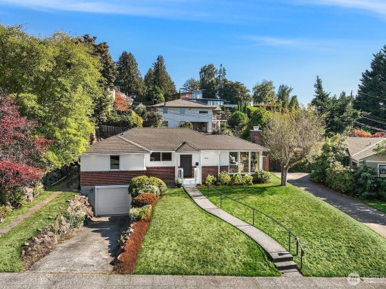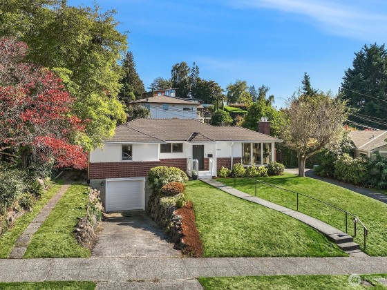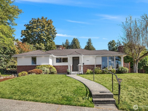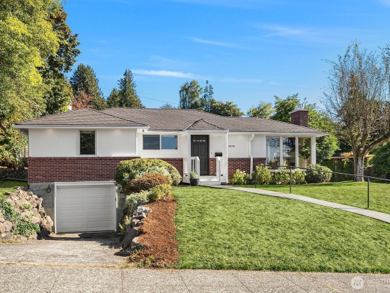 Contemporary updates blend w/ mid-century elegance in this Belvedere Terrace home, perfectly situated on an expansive, sun-drenched lot. The living room, bathed in natural light from its floor-to-ceiling windows, is anchored by a marble fireplace & rich hardwood floors. The dining room seamlessly opens to an inviting deck, ideal for entertaining. The kitchen is equipped w/ SS appliances, brushed brass hardware, & Corian countertops. Three generous bedrooms & an updated bath complete the main. The lower level offers a private retreat, including a remodeled family room w/ wet bar, a nonconforming bedroom or office, a second marble bath, a laundry room & a one-car garage. Soak in NE Seattle living w/ territorial views in this ideal location!