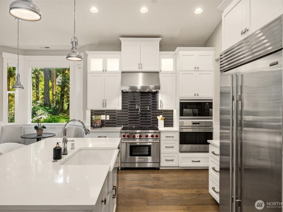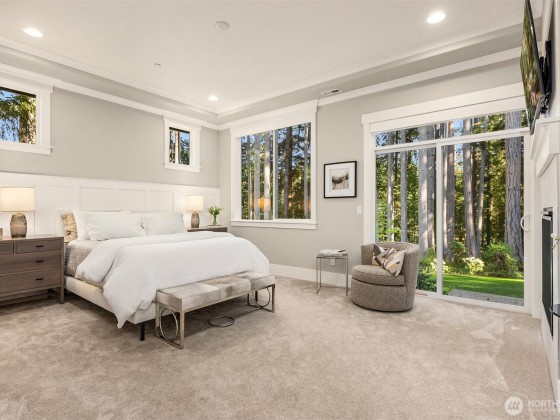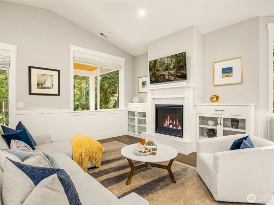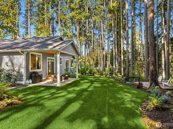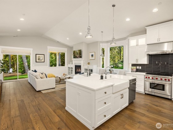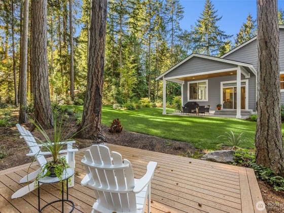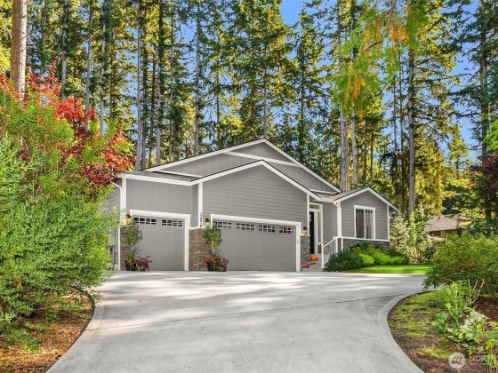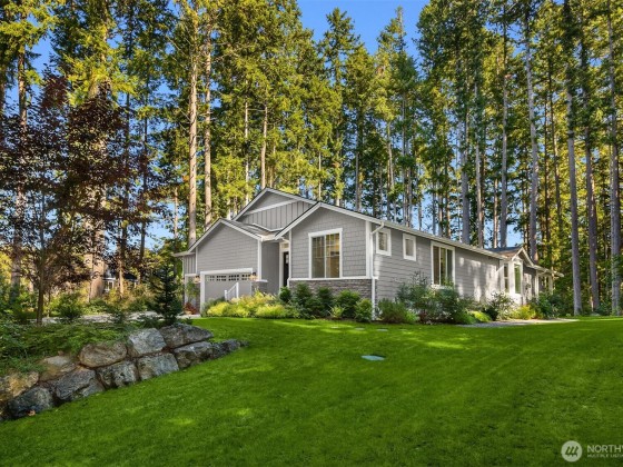 Tucked away in Hidden Cove Heights, this stunning one-level home built in 2021 blends modern comfort with timeless charm. Set on 2.5 serene acres with mature landscaping, it offers exceptional indoor-outdoor flow. Three bedrooms plus a main-floor office provide flexible living. The primary suite features a cozy fireplace, spa-like bath, and backyard access. A chef’s kitchen shines with a wet bar, prep kitchen, walk-in pantry, Sub-Zero fridge, and Wolf range—perfect for entertaining. Additional highlights include a whole-house generator, three-car garage with epoxy floors, premium storage, and a covered patio for year-round enjoyment. Just steps from Port Madison Yacht Club and Hidden Cove Waterfront Park. Welcome home!