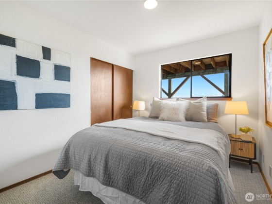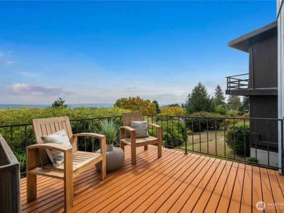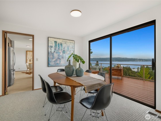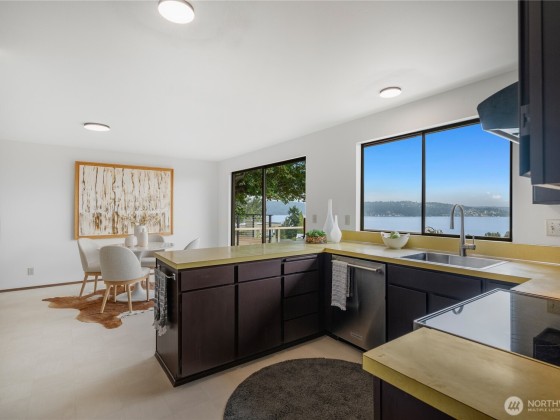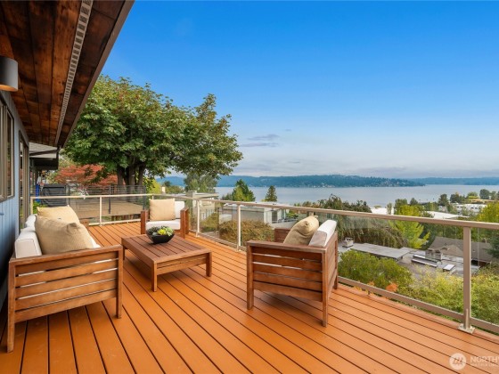 Grab a front row seat to the splendor of the Northwest! Generous windows embrace the main living areas of this 1968 custom home, filling the rooms with light. Wake to striking panoramic sunrise views over the lake and to the mountains, watch the seasons take hold, the glow of autumn paint the trees, and bright clouds roll across the sky. The open flow provides ample space for dinners and kitchen dance parties, for work and workouts, and a flexible footprint in which to shape the home of your dreams. The main floor primary has a sense of privacy and retreat, with four more bedrooms on the lower level as well as a family room. This home has an active transferable membership in the View Ridge Swim & Tennis Club located just down the street.