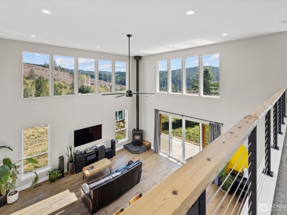 Stunning custom home on just under 3 acres with sweeping territorial views. This 2,683 sq ft, 2 bedroom, 2.5 bath home features an open floor plan with 9’ ceilings throughout and an impressive 19.5’ ceiling in the living room with walls of windows for natural light. The main level offers ¾” maple hardwood floors, wood stove, and a chef’s kitchen with 12’ quartz island, gas range, and large pantry. Upstairs includes a loft, two bedrooms, highlighted by a spacious primary suite with walk-in closet and spa-style bath featuring soaking tub, dual sinks, and large walk-in shower with dual heads. A separate 8’x24’ balcony provides a peaceful space to enjoy the view. Attached 876 sq ft garage with shop area and 18’ workbench completes the property.