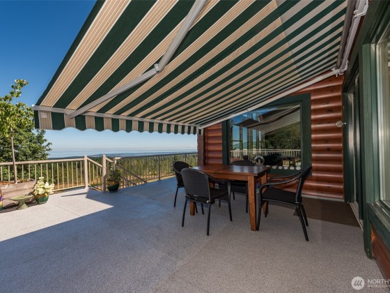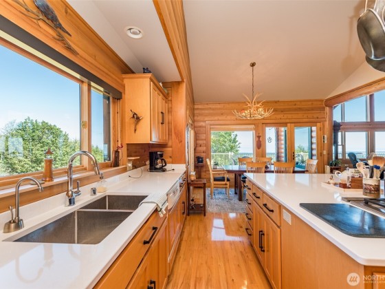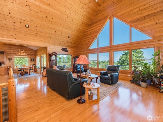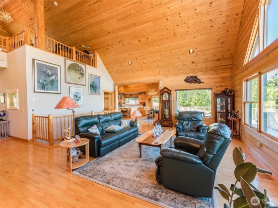 Dream log home and guest apartment on 20 acres overlooking Sequim, and Strait of Juan de Fuca. Superb quality, unprecedented natural beauty, world class views and a rare level of privacy that only 20+ gated acres can provide. Built by the incomparable builder David Highlander, the home was built with kiln dried & laminated cedar logs w/12 inch lag screws and R60 insulation. The maple floors, pine ceilings, and hemlock doors & trim provide a feel of natural beauty befitting the incredible property. Views stretch east to the Cascades with a clear shot of Mt. Baker, Protection, Whidbey and San Juan Islands, Victoria B.C. all of the Dungeness Valley and Sequim and of course the shipping lanes of the Strait of Juan de Fuca. short drive to town.