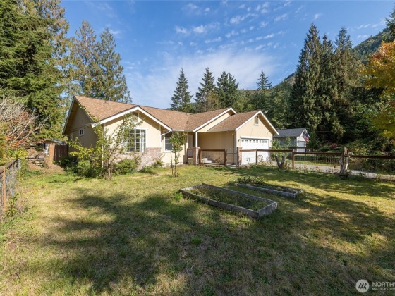 Surrounded by the beauty of misty mountains, this inviting home offers the perfect blend of comfort & PNW charm. An abundance of natural light fills the open floor plan, enhanced by vaulted ceilings & a warm wood-burning fireplace. Kitchen features a spacious walk-in pantry and breakfast nook. Primary bedroom includes a private ensuite bathroom, offering a peaceful retreat. Step outside to spacious front & back yards w/ ample garden space, perfect for relaxing and entertaining. In the spring, enjoy vibrant blooms & a variety of fruit trees. Whether you’re seeking a peaceful escape or an active lifestyle, you’re only 45 minutes from Mt. Baker & 40 minutes from Bellingham, giving you easy access to all your favorite adventures!
