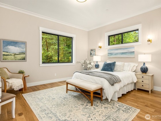 NEW CONSTRUCTION - Quiet oasis at the end of the road. South Facing, w/excellent natural light in mind. Flexible layout w/2nd primary suite on main floor. 2x height great room w/floor-to-ceiling windows overlooking 1.5 acres of sunny Eagledale forest. Chef's kitchen w/ high-end appliances. Primary suite w/spa-like bath in its own 'private wing'. 2 extra full baths upstairs for a total of 4.5 baths. Generously sized rec room & laundry room, formal office, plus 1500+ sq ft of storage in unfinished daylight basement. Picturesque 10-min drive along Eagle Harbor to Seattle ferry. Adjacent to a vast trail system connecting you to water access at Blakely Harbor & Pritchard Park. Artfully landscaped, 3 car garage. A phenomenal value at $596/sq ft!