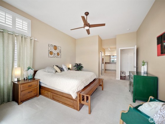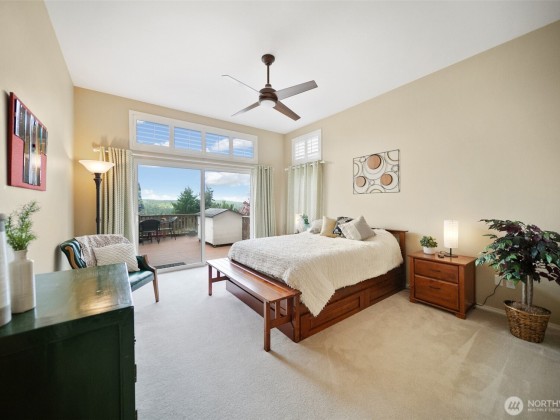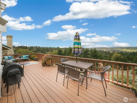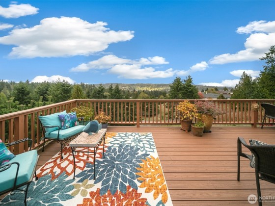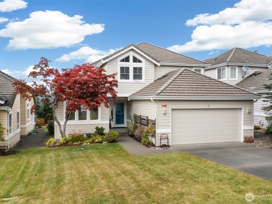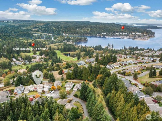 Nestled in a serene, upscale neighborhood, this main-level living gem is the ONE! Its inviting floorplan boasts soaring ceilings, abundant natural light, & gleaming hardwood floors. Two cozy fireplaces warm spacious living areas, perfect for relaxing evenings. Step onto the expansive deck w/a remote awning to savor stunning golf course, Ludlow Bay & Olympic Mountain views. The sleek, updated kitchen dazzles with style. Spacious primary suite offers private back porch access and features a luxurious, renovated bath w/a large walk-in shower. Upstairs, discover two airy guest rooms, a full bath, and an office with a view. Impeccably maintained to include fresh exterior paint. Steps from miles of trails, golf, marina & Bay Club. Welcome Home!