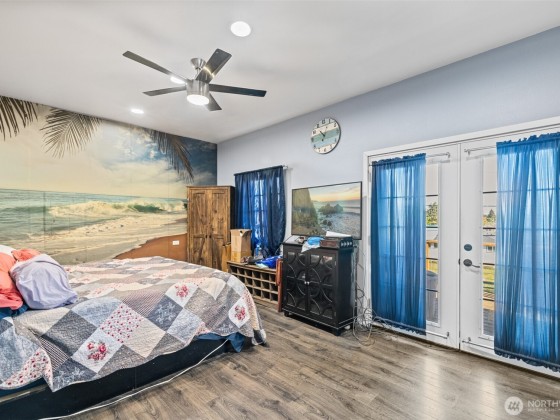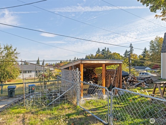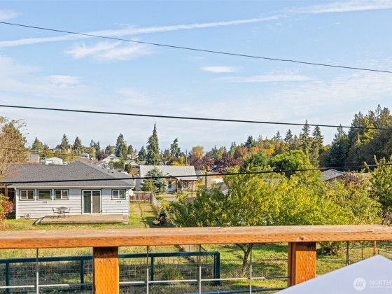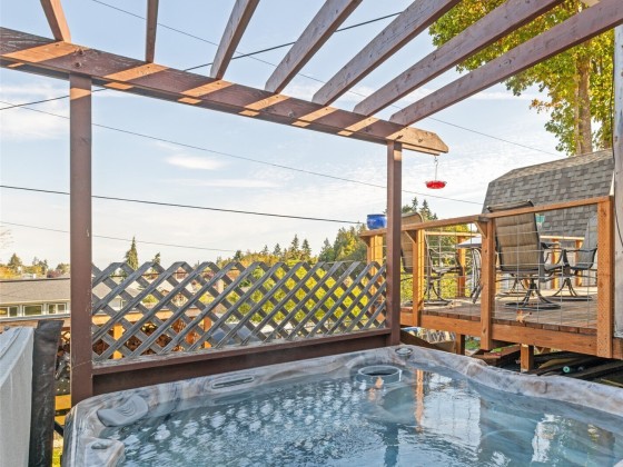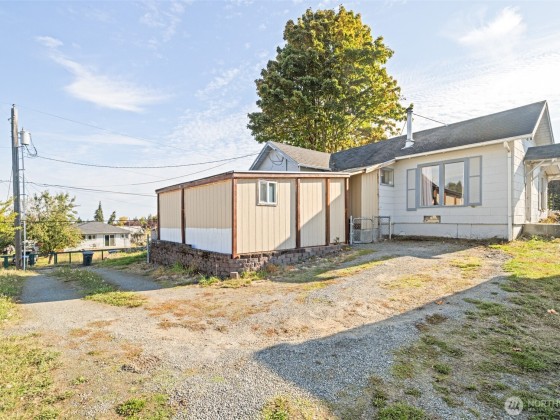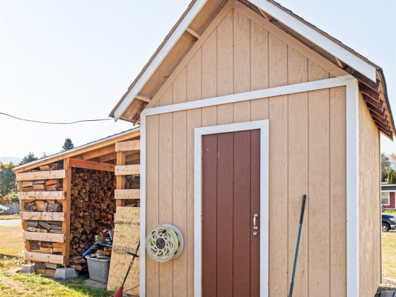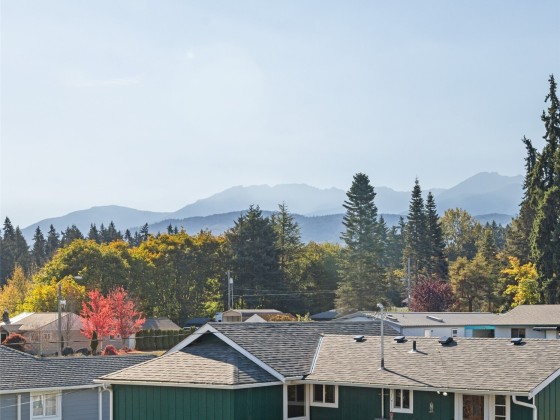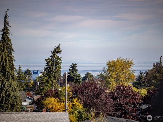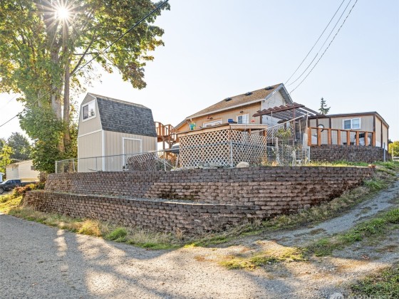 Enjoy tranquil city living in this lot-and-a-half home, featuring southern mountain views & ambiance of simplicity. The expansive front yard invites creativity (second living unit, orchard, or?), while partial views of the Straits create a northern backdrop. Enjoy the convenience of street & alley access, finished outbuilding, shed & detached office boasting bird's-eye views & private deck, perfect for peaceful workdays. Inside, the home features laminate plank floors, custom built-in storage, wood stove & walk-in pantry, among other custom details. The massive bedroom w/tall ceilings & oasis mural leads to an organized closet. Step outside to a patio complete w/hot tub & grand retaining wall that enhances both privacy & elevation!