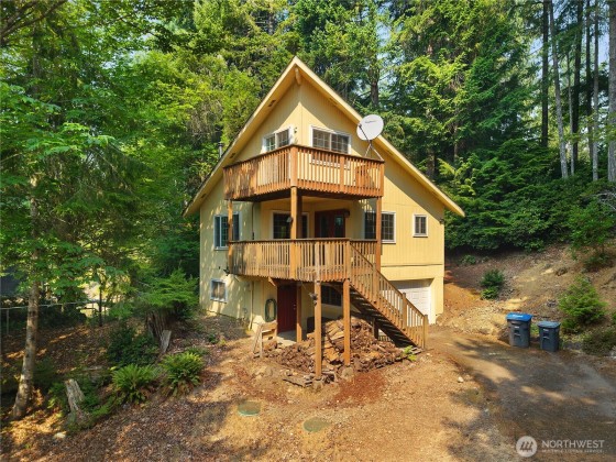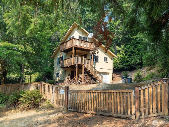 Tucked among the evergreens, this charming 2-bedroom + office, 1.75-bath home feels like living in a treehouse. Large windows frame serene forest views, filling the space with natural light. Cozy up by the wood stove or enjoy the peace and privacy from one of the three decks. A flexible office space is perfect for remote work or hobbies. The attached garage offers ample storage space. Fully fenced for privacy and to allow your furry friends to roam freely. Community beach access to beautiful Hood Canal offers endless opportunities for kayaking, beachcombing, and relaxation. A tranquil retreat that blends comfort, nature, and coastal living. Come see it today!
