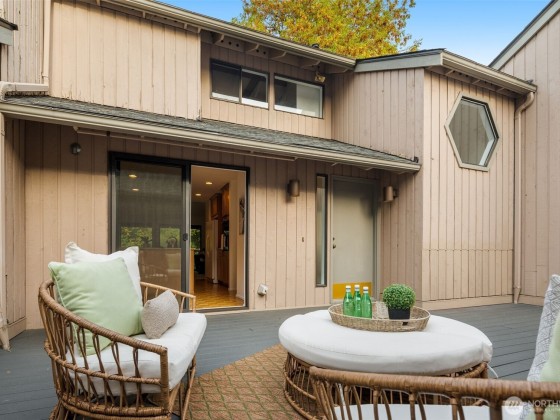 Tucked into a peaceful greenbelt with a year-round creek below, this refreshed townhome feels like a serene retreat and lives like a single-family home. Freshly painted with new carpet, you are welcomed by original hardwood parquet floors, a bright kitchen and sunny nook opening to a spacious private courtyard deck, perfect for morning coffee or evening gatherings. The vaulted living room has stylish wood beams, a modern gas fireplace insert and opens to a treetop deck. Two restful bedrooms, including primary suite, and a sunny loft with its own bath offer flexible space for work or other endeavors and great guest space. A spacious separate 2 car garage and tons of closet space round out the livability of this home.