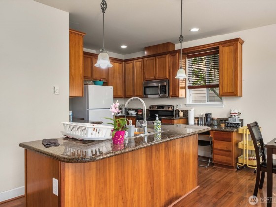 Welcome to this beautiful end-unit townhouse in the desirable Maplewood Grove gated community! This two-story home features 3 bedrooms, 2.5 bathrooms and 1,849 sq. ft. of comfortable living space. The open-concept layout offers a spacious and inviting atmosphere with vaulted ceilings, a large kitchen with granite countertops and a breakfast island, and laminate flooring throughout the main level. The bright living and dining area includes a large sliding door that opens to the back patio and a fully fenced backyard. All appliances are included. The attached 2-car garage offers convenience and extra storage. Ideally located close to freeways, Kent Station, shopping, dining, parks, and public transit. Must see!