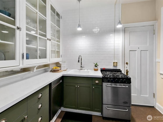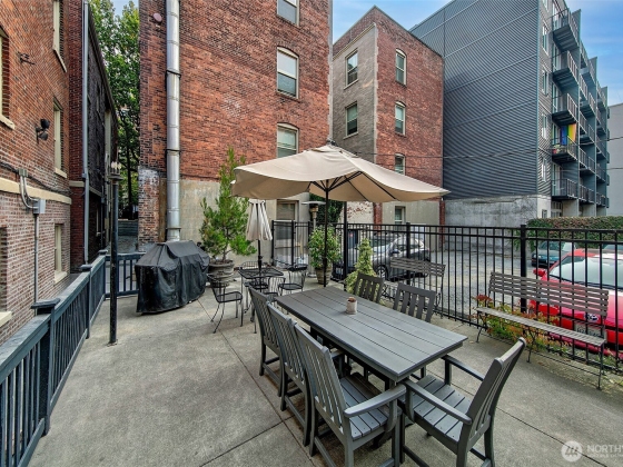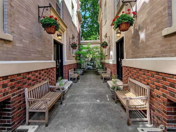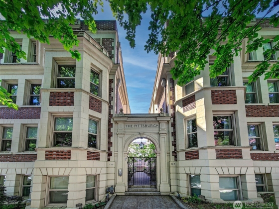 Top floor unique floorplan that allows no shared walls at the elegant Pittsburgh; brownstone style condos in lower Queen Anne. Location is iconically Seattle; two blocks to monorail- one stop to the light rail station. Tranquil spaces w/ beautiful old world architecture throughout. Gorgeously updated condo with built ins, history & charm in every nook. High ceilings, original fir floors, rich trim, extra large dining/den, gas fireplace & additional storage. Don't miss the welcoming BBQ courtyard that brings the community together. Recent renovations to the building give peace of mind for this next chapter. Walkscore is near perfect; groceries, top restaurants, Pike Place, Met Market & Climate Pledge a stones throw away.