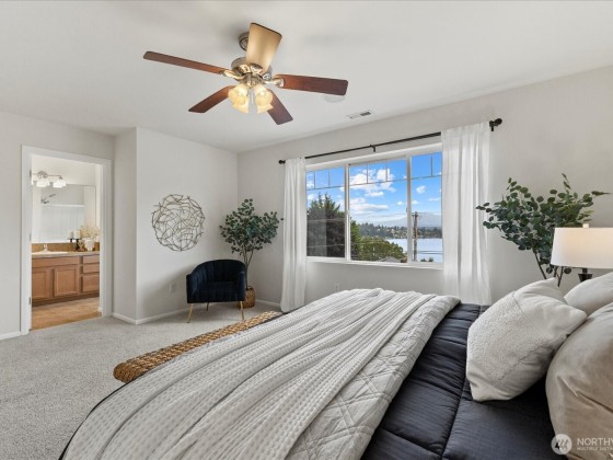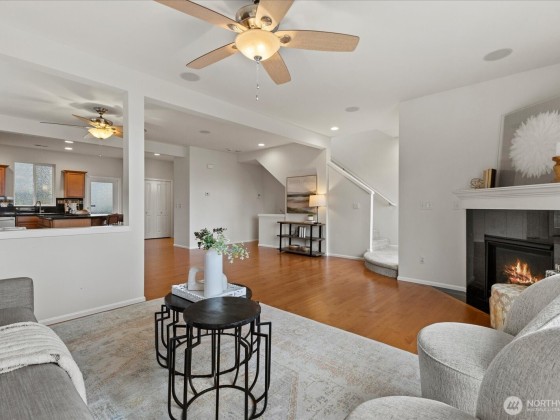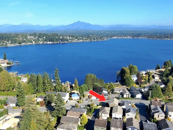 Lake Views! This 1,960 sq. ft. Lake Point home is perfectly placed to capture some of the best vistas in the neighborhood. The open great room with corner fireplace flows to a covered deck overlooking Lake Stevens. The kitchen features granite tile counters, Samsung appliances, and a breakfast bar. Upstairs, the primary suite offers a spa-inspired bath and walk-in closet. Central A/C, hardwired surround sound, new water heater installed in 2024, and a serviced furnace ensure comfort. A private driveway, oversized garage, and fully fenced patio complete this exceptional property—just minutes to Frontier Village and Lundeen Park.