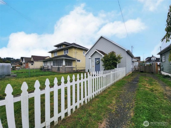 Super Cute & Affordable 3-Bedroom 910sf Home w/HUGE Shop in a Lovely Hoquiam Neighborhood! Enjoy this inviting 3BD/1BA home featuring a spacious 720 sq. ft. shop/garage & ample parking with room for an RV. Located in a walkable neighborhood close to town amenities & just a short drive to the coast, this home offers high ceilings, abundant natural light, & thoughtful updates incl. newer wiring, windows, flooring, & paint. The open living/dining area flows into the kitchen with bar & cozy sitting nook, while a covered side porch is the perfect spot for coffee. The oversize shop boasts a durable metal roof, laundry area, & water heater—ideal for projects & storage—with appealing fenced yard & long driveway - Ask for a showing today!