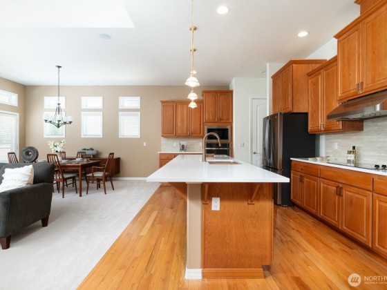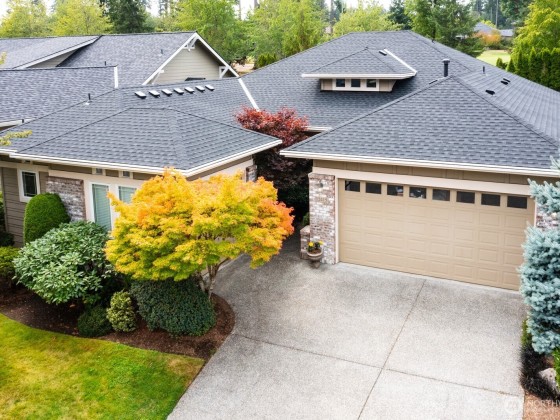 Beautiful updates such as New Roof, stunning quartz countertops and stainless appliances. Nestled in coveted Trilogy 55+ community, this desirable Hemlock plan is appointed with a two-story ceiling at entrance, a great room, cozy fireplace and dramatic window wall, illuminating light. Formal dining room plus dining area off great room with backyard views and access to large deck and fenced yard. Chef’s kitchen provides a large island, an abundance of cabinets and counter-space, pantry and access to mud/laundry room off garage. Sizable bedrooms including primary suite with two walk-in-closets, a 5-piece bath, and guest en-suite with full bath and den with French doors. Third Car garage bay for golf cart. Close proximity to Club house!