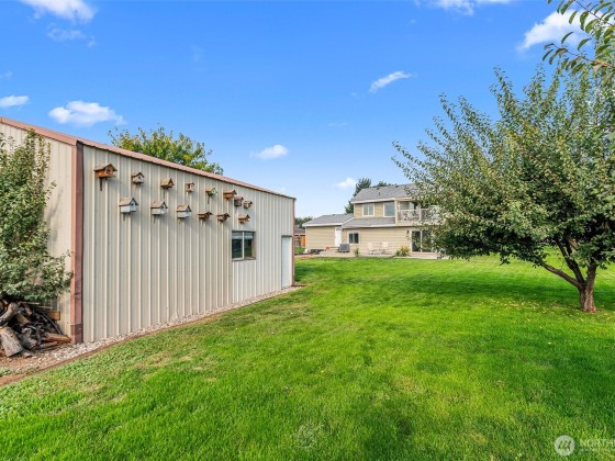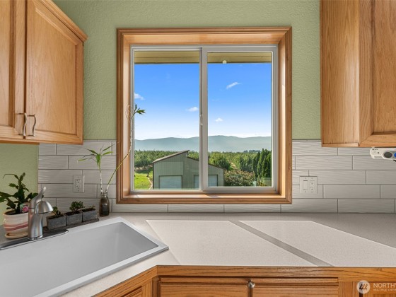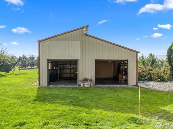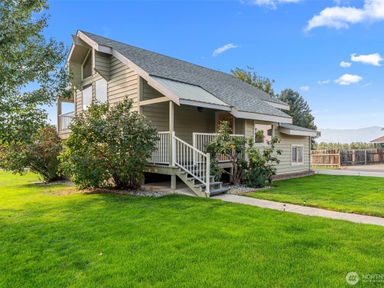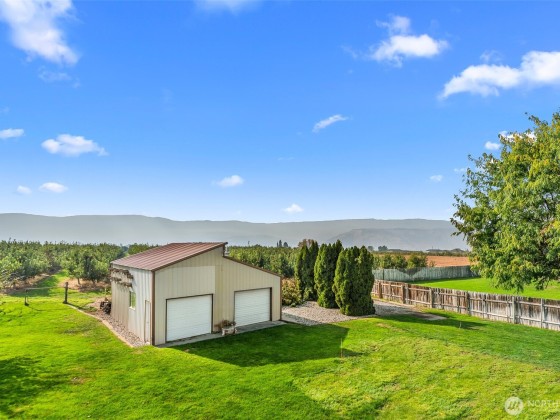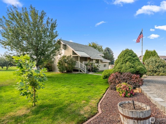 Light-filled home on a shy half-acre lot with a shop, ample parking, fruit trees, berry bushes, and garden space. Meticulous turn-key property with covered front porch, back deck, and views of orchards, vineyards, and Malaga slopes. Open layout with vaulted and beamed kitchen, living room, dining, and office on the upper level; bedrooms in walk-out basement. Primary bedroom features a slider to patio, walk-in closet with closet system, and attached bathroom. Attached garage, detached 2-bay shop with power, RV parking, irrigation water, new septic tank, remodeled bathrooms, and windows updated approx 6 years ago.