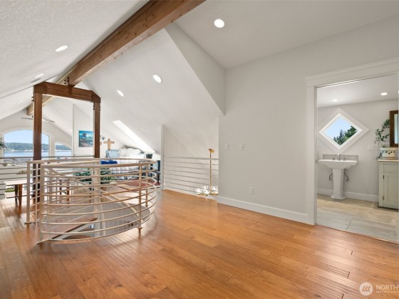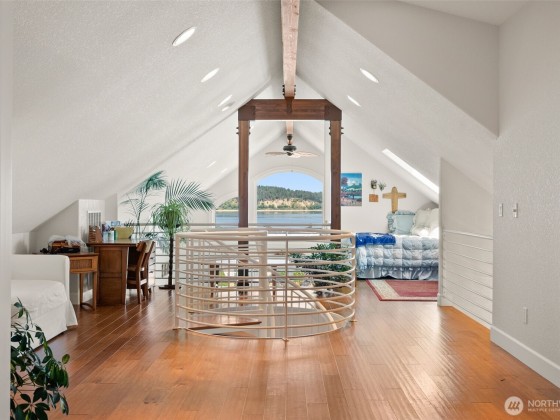 Rare two-lot property with main floor living and Puget Sound and Mt. Rainier views from your primary suite and open living areas. Vaulted ceilings, dramatic wall of windows, and a two-sided fireplace create a light-filled space. Everything you need for daily living is on one level: primary bedroom, full bath, kitchen, living, and dining; with upstairs flexibility when needed. Bridge access means no ferry, just a five minute walk to the community beach. The loft and guest bedroom with separate entrance offer options for family, hobbies, or workspace. Two legal lots mean choices: sell one or keep both for privacy. Main-floor bath connects to garage for easy beach days. Priced at $749,000 for island living with real flexibility.