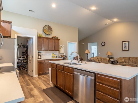 Discover this updated and move-in-ready Pacific floor plan, offering over 1,800 square feet of comfortable living space. The thoughtfully designed single-story layout provides 3 bedrooms, 2 full baths, and a private den or home office. The interior has been refreshed with new flooring and fresh paint, complemented by vaulted ceilings that create an open and airy feel. Step outside to a covered patio in your fully fenced yard, or utilize the oversized, fully finished garage with an 8-foot extension for your hobbies and storage needs. You'll love the convenient location near all the conveniences in town.
