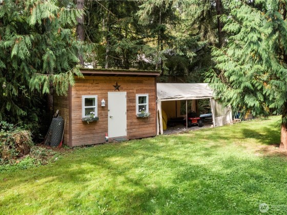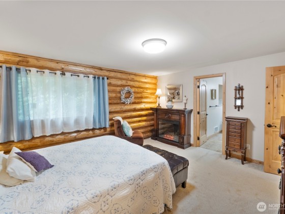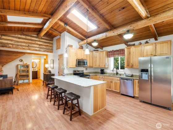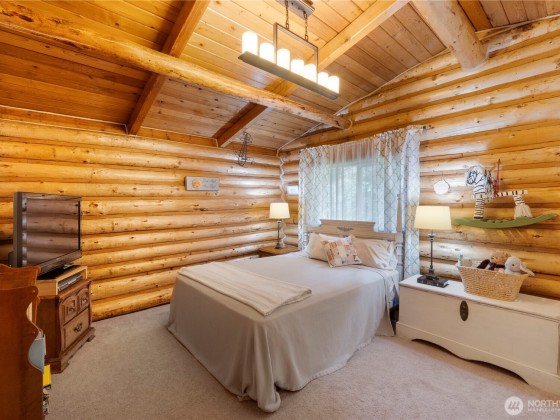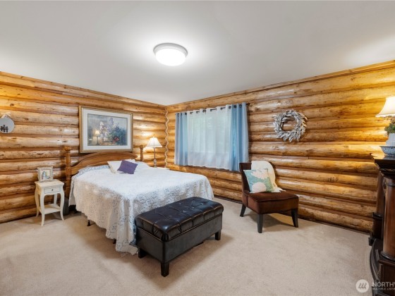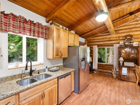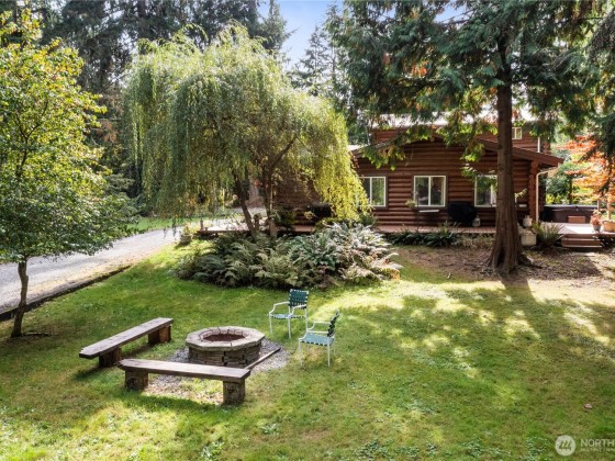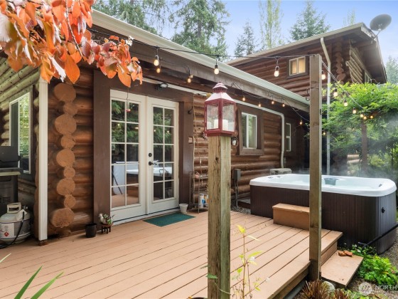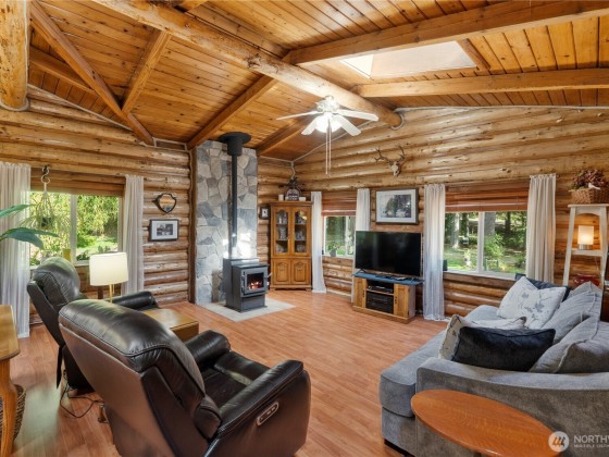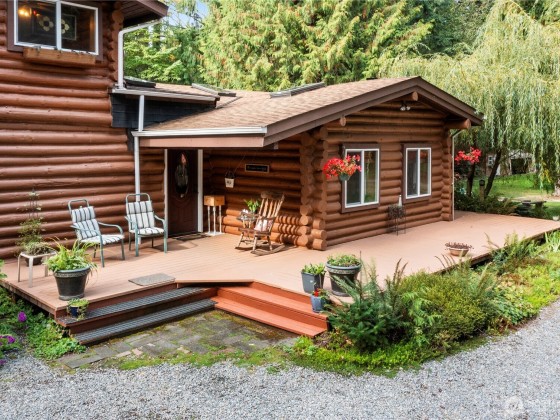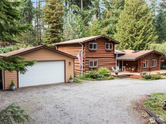 Situated on 2.4 secluded wooded acres, stunning 2-story log home totally remodeled offers the perfect blend of rustic charm & modern comfort. Featuring 3 bdrms, 2.25 baths, the home welcomes you w/vaulted ceilings, skylights & beautiful French doors. Main Floor Primary Bdrm Enjoy year-round comfort w/efficient mini-split heating & cooling, plus the warmth of a pellet stove. Entertain or relax on the expansive wrap-around deck, perfect for soaking in the peaceful surroundings. Detached garage offers storage & best of all, no HOA! Even w/its private, wooded setting, you're just minutes from shopping, schools, dining, & freeways. This is PNW living at its finest—privacy, nature, & timeless log home charm w/everyday convenience close by.