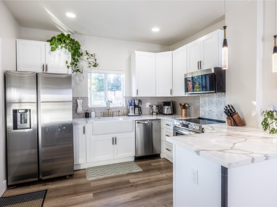 Discover the feel of a brand-new home- crafted for comfort, privacy, and the space you’ve been searching for. Fully renovated in 2023, this home sits on a private, level acre bordered by Mattson Middle School for rare seclusion. Better than new construction, it features a new kitchen, paint, baths, flooring, electrical, plumbing, windows, doors, roof, siding, and a wrap-around deck. Enjoy 9-ft ceilings, a bright great room, and a stylish kitchen for gatherings. The main-floor primary suite offers a spa shower, soaking tubs, and a walk-in closet. Three bedrooms plus two flexible rooms for an office or studio. No HOA and plenty of room for a small business, RV, or work vehicles. Minutes to Covington Town Center, Costco, dining, and parks.
