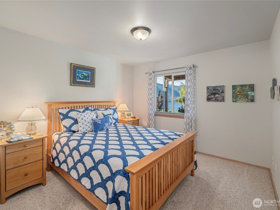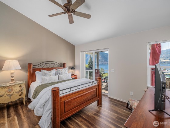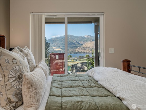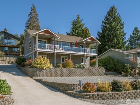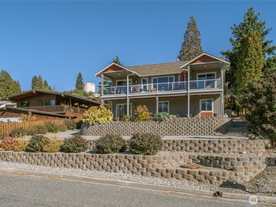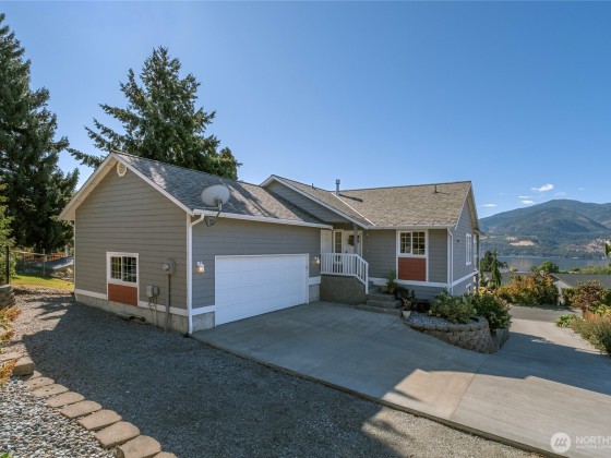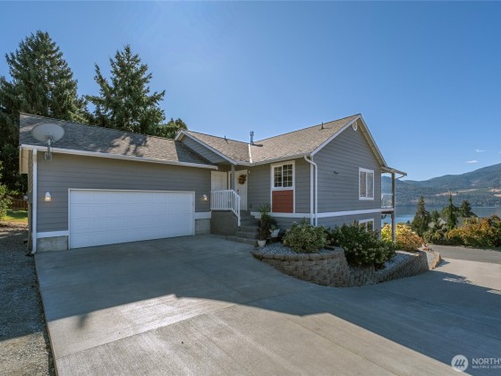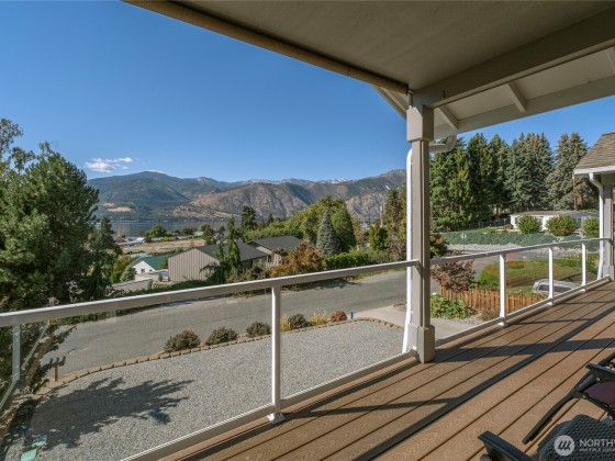 Incredible Lake Chelan views from this beautifully designed home featuring an open floor plan with vaulted ceilings and newer Stainless Appliances, Dekton counters & sink in the kitchen. Enjoy full main-floor living with two covered areas on a 304 sq. ft. deck. The primary suite includes a well-appointed ensuite, while the lower level offers a family room, two bedrooms, guest bath, and laundry with access to a 304 sq. ft. patio. Quality finishes, large view windows, a 2-car garage with great storage, low-maintenance landscaping, and optional RV parking. Close to the lake, marina, and town!