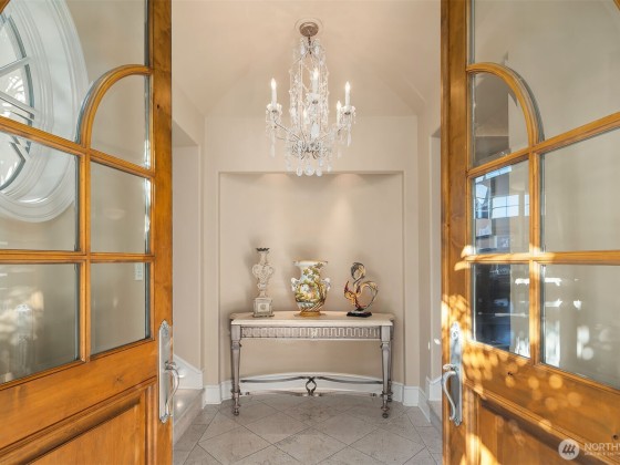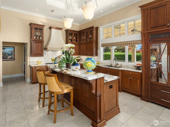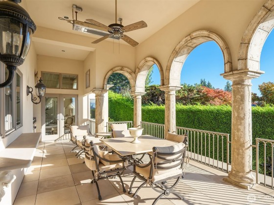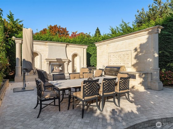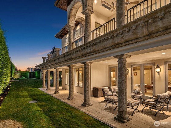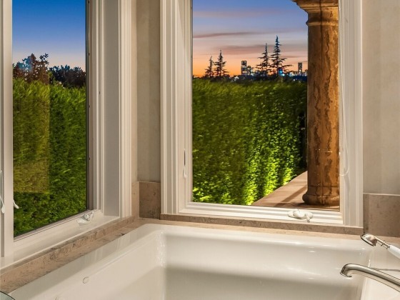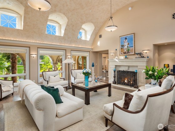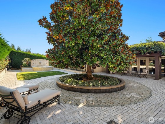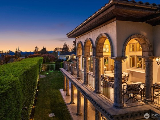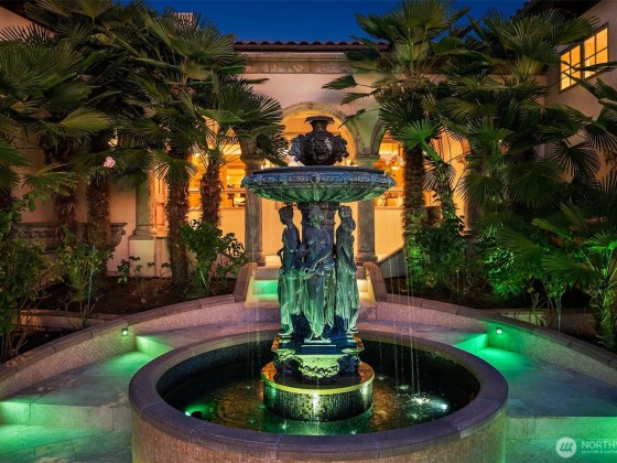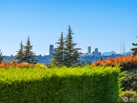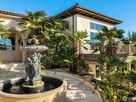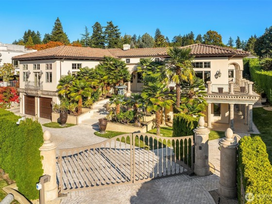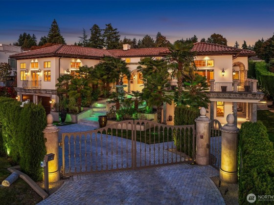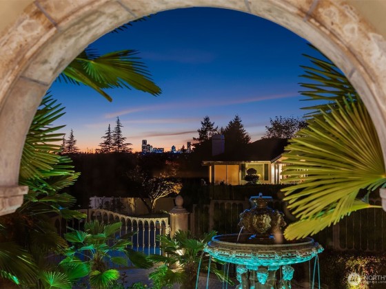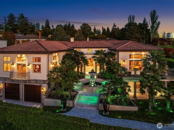 One of a kind Mediterranean style home minutes from DT Bellevue feat. Seattle skyline views. Quality built. Fully fenced, surrounded by hedge & secured w/security camera & motion. Professionally landscaped gardens, w/palm trees, original bronze entry fountain, limestone tile driveway. Tile roof. Grand outdoor stone terrace w/fireplace & BBQ. Backyard stone hot tub. Beautiful warm interior w/radiant heating, vaulted ceiling, spacious kitchen w/city view, ultimate recreation/media level w/opulent finishes & mini bar. Main floor master & guest suites w/soaring ceiling heights. Solid integrity w/classic artistic flair is captured within every fine detail. 3 + 2 heated gar. Over $700k spent on landscaping, security, interior updates & remodeling