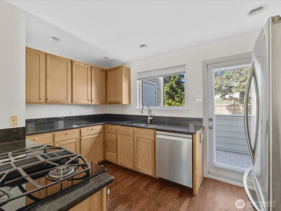 Freshly remodeled multi-level townhome with a view of Bitter Lake! Hardwood floors. Granite slab countertops in kitchen, gas range, newer fridge, dishwasher and garbage disposal. Efficient radiant floor heating, gas fireplace, security system, new flooring and new paint throughout! Upper level has 2 large bedrooms, including primary suite with vaulted ceiling. First floor bedroom has its own 3/4 bath. 1-car attached garage with storage space, additional off-street parking for 2nd car. Decks off of living room and kitchen with storage closet. No homeowner dues! Fast access to I-5, minutes to Seattle, the Eastside, Everett. Brand new wood fence and gate just installed!
