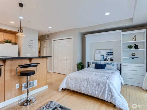 Discover this gorgeous studio in highly desirable Old Town Bellevue! Astoria at Meydenbauer Bay, one of Bellevue’s most desirable boutique residence, offers secured entry, gated parking, elevator,extra storage, concierge service, and a courtyard for entertaining. This stylish condo features a wall bed, fresh paint, hardwood floors, granite kitchen countertops with bar seating, spacious bath, and new in unit washer/dryer. Floor-to-ceiling windows fill the space with natural light. Enjoy premier city living just steps from Bellevue’s best dining, shopping, and scenic parks. Enjoy the low-maintenance urban lifestyle.