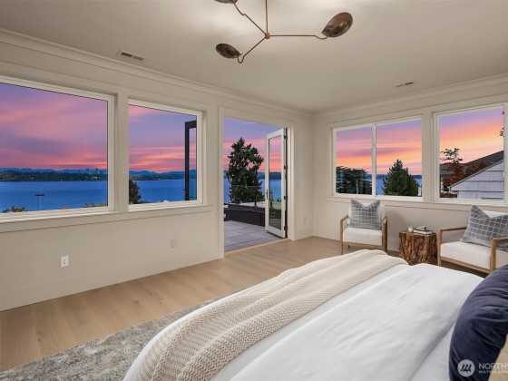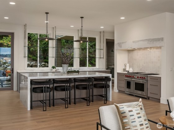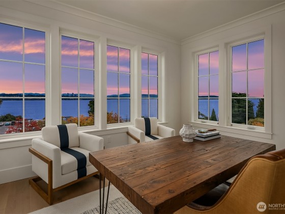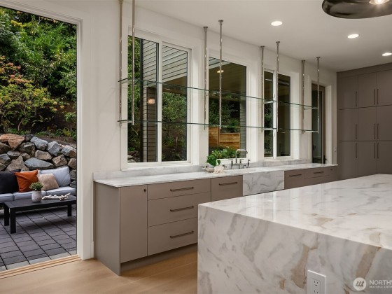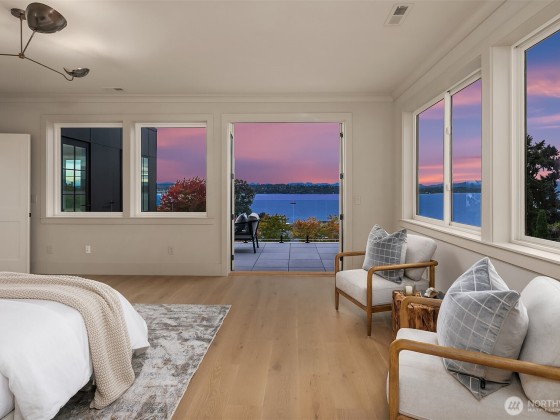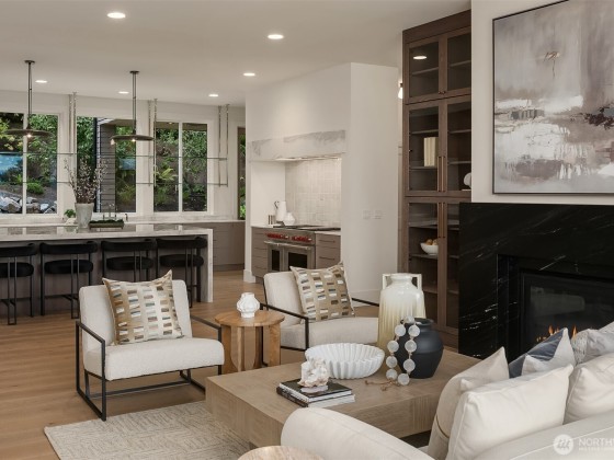 Stunning new construction with sweeping views of Lake Washington, the Cascades, and Mt. Rainier. Wrapped in warm cedar, the home centers on a view-forward great room and four patios for seamless indoor/outdoor living. The chef’s kitchen shines: a spacious marble waterfall island, Sub-Zero refridgerator, Wolf range, and elegant glass shelving. Two offices capture the panorama, and an elevator serves every level. The covered outdoor kitchen-fireplace, BBQ, refrigerator drawers, and heat lamps welcome year-round enjoyment. Six bedrooms (or five plus a second office), 4.5 baths, media room, wine cellar, designer lighting, and a Costco room w/two fridge/freezers and abundant storage. Three garages: an attached two-car plus an additional single.