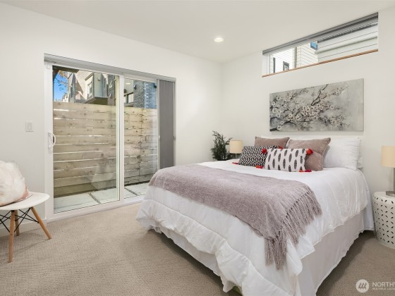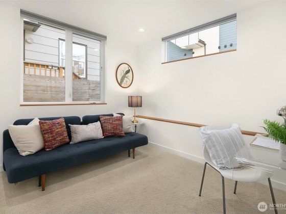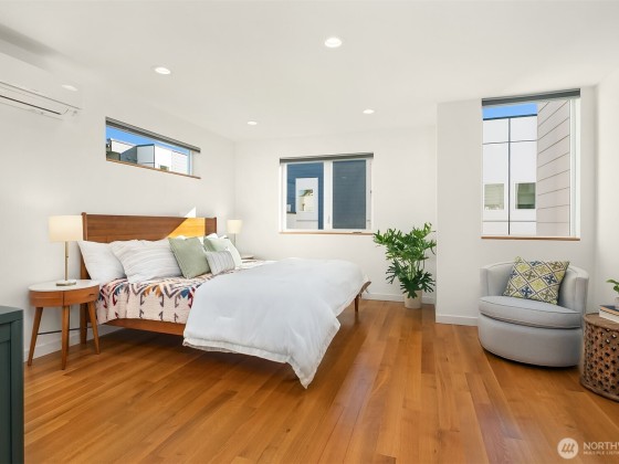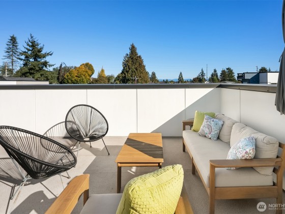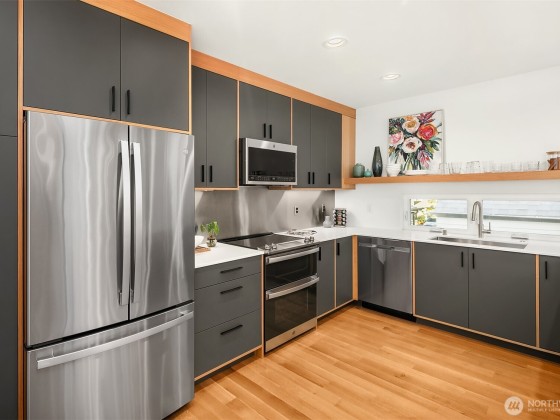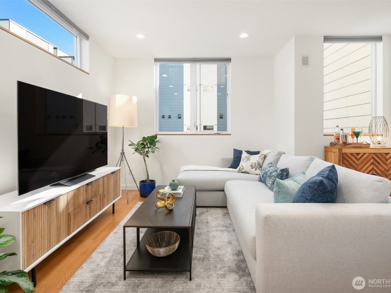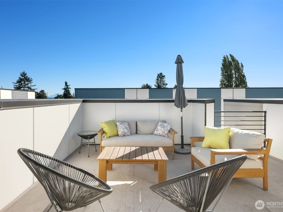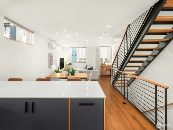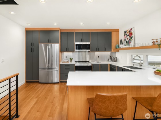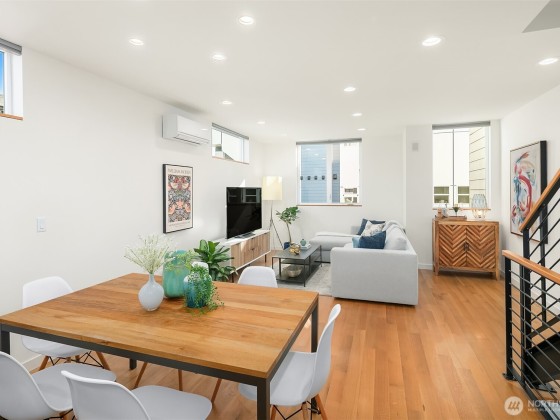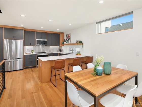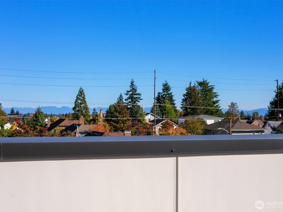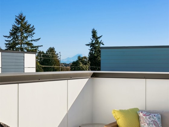 This stunning end unit modern townhome is better than new, with abundant natural light. Enjoy a gorgeous open kitchen featuring two-tone cabinets, quartz countertops & a stainless steel GE appliance package.The home includes three spacious bedrooms, with a luxurious primary suite that has a walk-in closet and washer/dryer (plus second hookup on lower level). Stylish bathrooms boast contemporary tile and fixtures. High-end finishes like solid hardwood floors and fresh interior paint enhance the space. An energy-efficient heat pump with air conditioning ensures year-round comfort. Relax on your expansive rooftop deck with views of Mount Rainier. 4- Star Built Green! Conveniently located near grocery, restaurants & transit—this is a must-see!