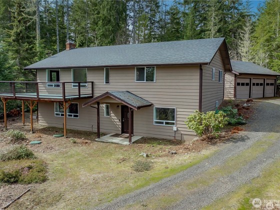 Perched above Hoodsport, this hilltop haven offers sweeping Hood Canal views and over 5 acres of serene privacy! Just up the hill from town, this 3 bed / 2.5 bath retreat blends seclusion with convenience. Inside, enjoy a beautifully updated kitchen w/ quartz countertops, sleek stainless steel appliances, & contemporary finishes throughout. The main-level primary suite and sunlit living room both showcase stunning views through expansive windows. Step onto the wrap-around deck to catch spectacular sunrises and soak in the peaceful surroundings. Outside, you’ll find vibrant garden space, mature fruit trees, RV parking, and a spacious 3-car garage—plenty of room to roam, relax, and entertain. Don’t miss this private slice of PNW paradise!