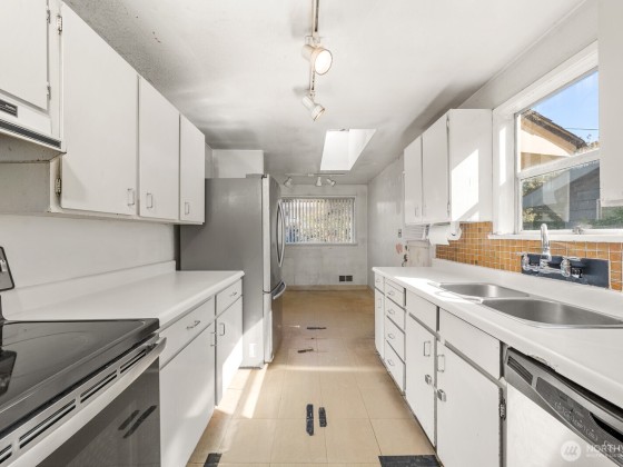 Investor Alert-development or rehab opportunity in the Broadview neighborhood for this solid 1950's rambler w/a daylight basement on a large, 9K+ lot. Kitchen has a skylight w/eating space, open to the dining area & living room w/hardwood floors, fireplace & access to huge deck. Two bedrooms are on the main w/full bath and skylight. Lower level has a 3rd bedroom, 3/4 bath, family/recroom w/2nd fireplace. Home has 2 mini-splits for heating/cooling, gas is available in the street. The home sits forward on this large, sunny lot w/expansive sunset views. Potential to keep existing house for full gut and remodel and/or expand + build a DADU or as per SDCI guidelines allow. Selling As-Is.
