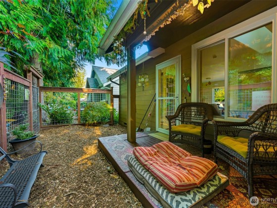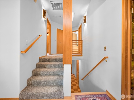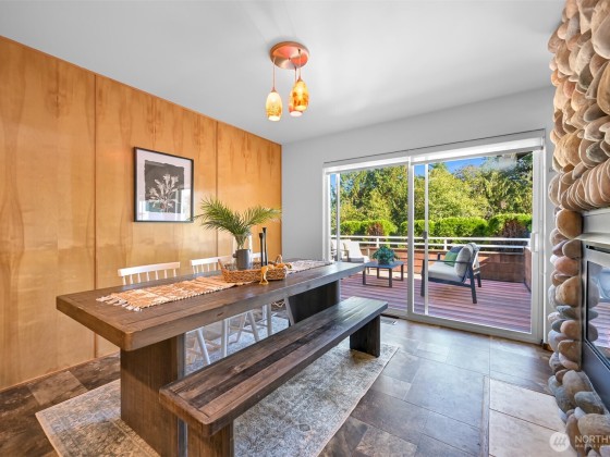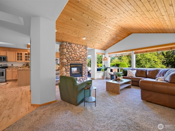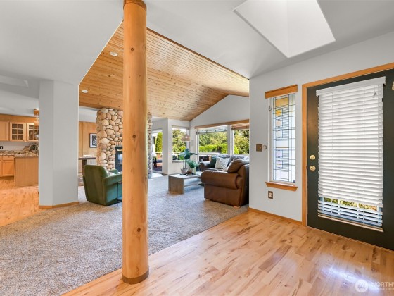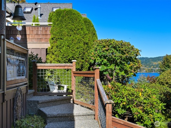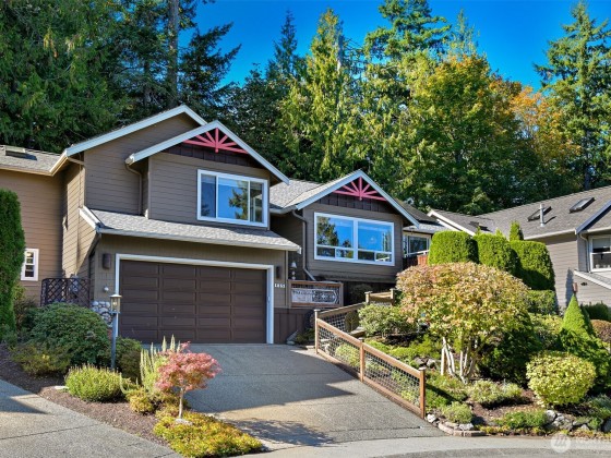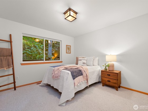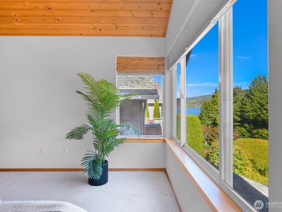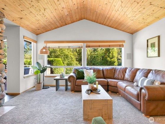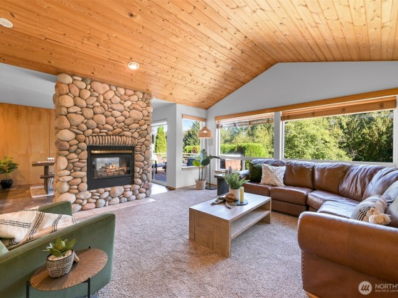 Tucked away in one of Bellingham's most peaceful and private cul-de-sacs, this beautiful Kenoyer-built home is a true retreat surrounded by mature trees and lush landscaping. Vaulted tongue & groove ceilings in the living room and primary bedroom, rich natural wood, and skylights with powered blinds fill the home with warm light. A two-sided river rock fireplace connects the living and dining areas, while the kitchen’s breakfast nook and deck spaces invite slow mornings or relaxed entertaining with peaceful views of Lake Whatcom. The upper-level primary suite offers a large walk-in closet and full bath. The entire interior has fresh paint, along with AC, solar panels combine comfort, sustainability and a timeless craftsmanship vibe.
