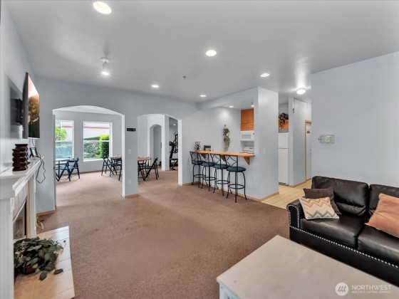 Welcome home to this well-maintained, top-floor condo that is move-in ready. Vaulted ceilings, expansive windows, and abundant natural light create a bright and inviting living space. The kitchen offers ample counter space, SS appliances, & breakfast bar that opens to the formal dining area. Relax in the cozy living room by the gas-burning fireplace or step out to your private deck overlooking the peaceful greenspace. The primary features generous closets & a full en-suite bath, + additional spacious bedroom/bath. In-unit laundry & the dedicated covered parking spot making this truly feel like a home. No pet restrictions and a fantastic location--Only 15 mins to the new Lynnwood Link Station for easy Downtown & SeaTac access.