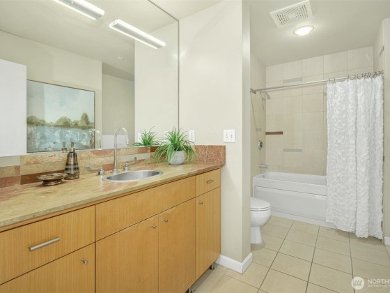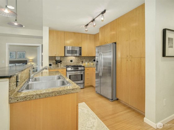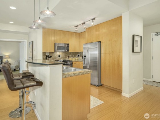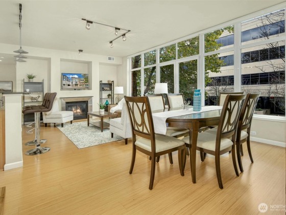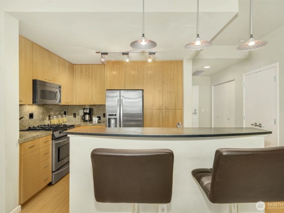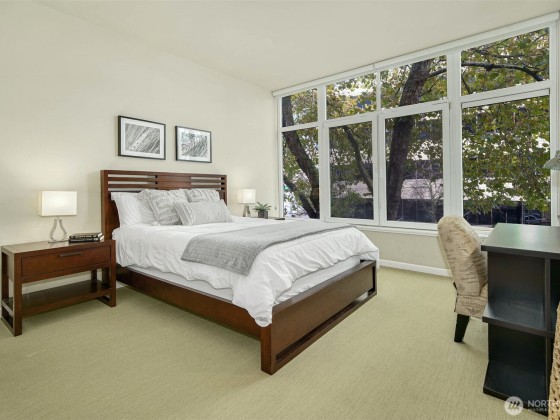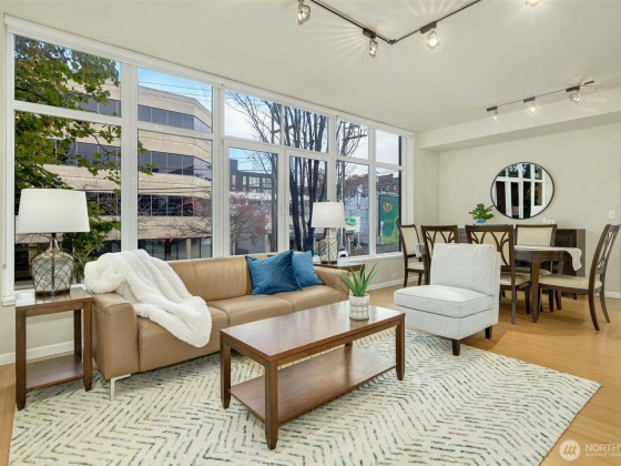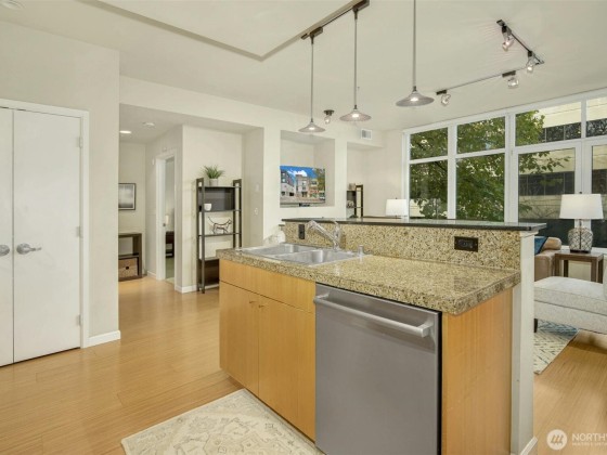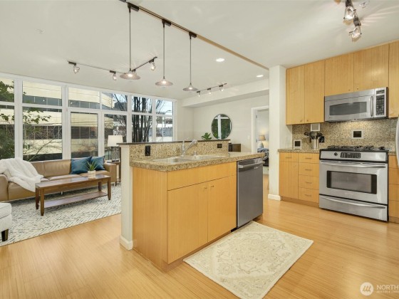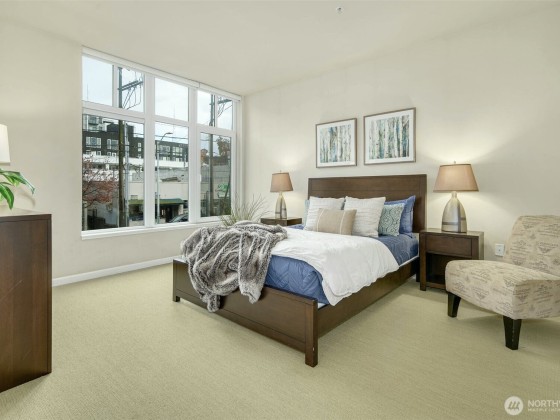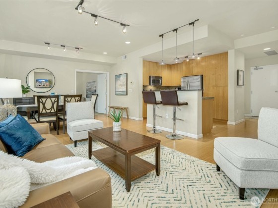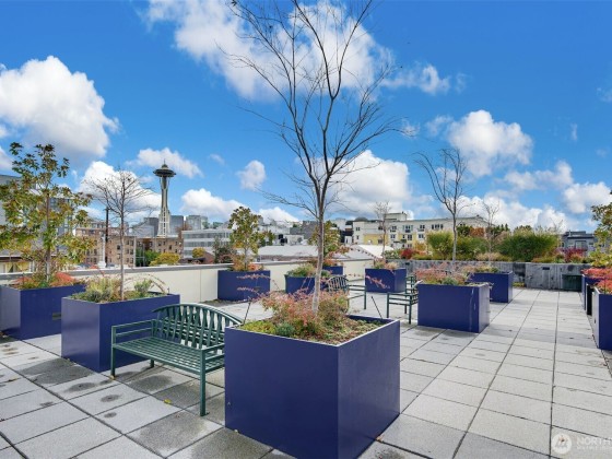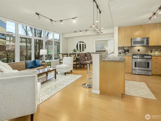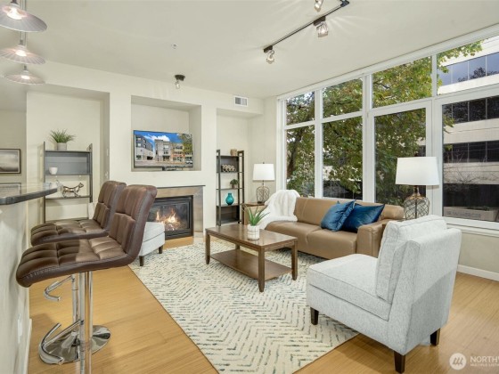 What a rare find! Comfort, style, and incredible value rolled into one! Whether you're investing or looking for a place to call home, this stair-free condo wraps you in modern ease. Light-filled with soaring ceilings, it features two oversized bedroom suites with walk-in closets and a full-size laundry room. The open layout flows from kitchen to dining to living, with a bar perfect for casual meals. Pet-friendly, secure building with garage parking. No rent cap and all utilities (except power) included—smart investment potential! Steps to theaters, cafés, grocery stores, and the Climate Pledge Arena. Don’t miss the rooftop deck with iconic Space Needle views!