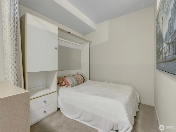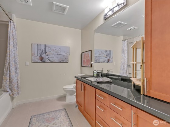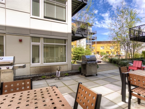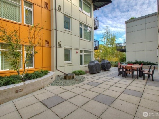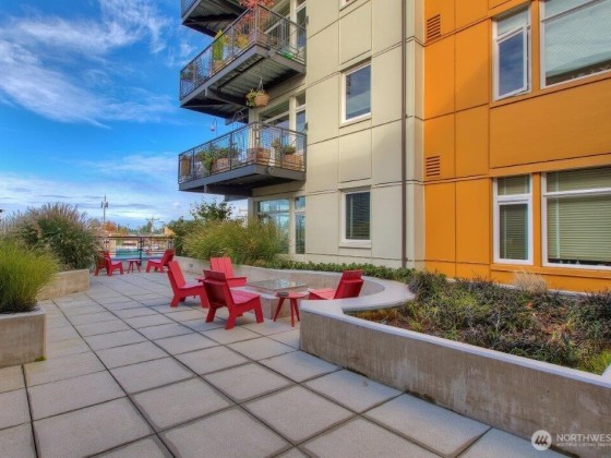 Wonderful light filled condo on 1-level (no stairs required). Features 1 Bed/1 bath & Den. Building features secure access via lobby entrance w/elevator or stairs or garage, 1 parking space (compact car size). This Condo is on the courtyard level, features a East facing patio w/sunny exposure. Kitchen w/granite & stainless appliances (gas range). Den w/a professionally installed Murphy Bed. Bathroom has luxuriously deep tub. BLDG has BBQ's, an exercise room, a Community Room, a Roof Top Deck, a Fire Pit area. Walk to the Transit Center, shopping, restaurants. Just steps from the weekly Farmer’s Market, library and a small dog park, with SeaTac Airport only a short drive away. Friendly neighbors & atmosphere! Seller has 3.25% Assumable Loan!