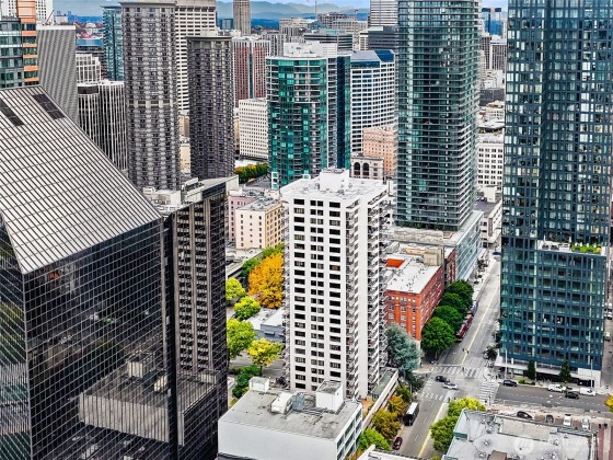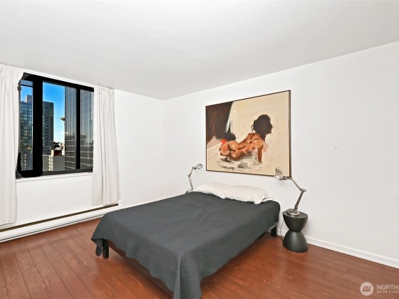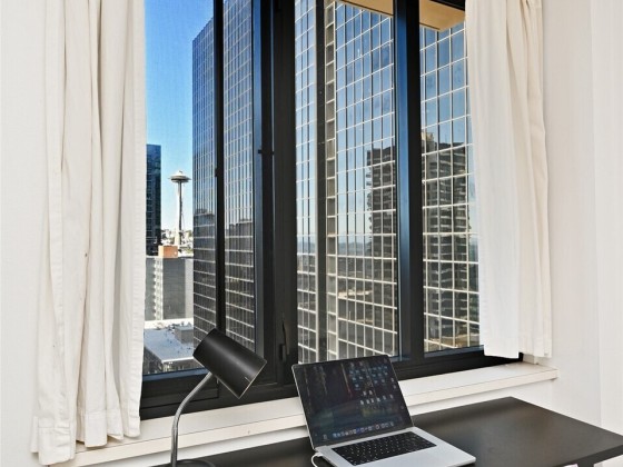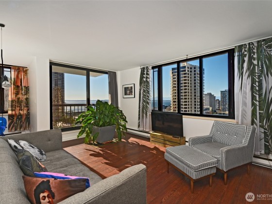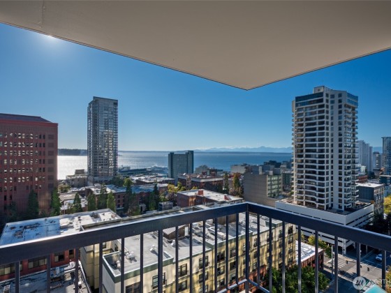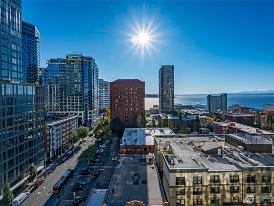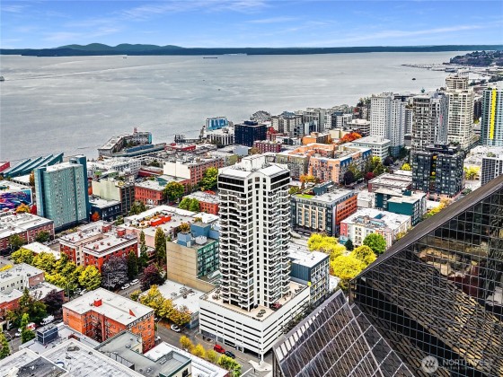 Fully furnished 2 bedroom, 1.75 bath corner unit on the 15th floor designed for comfort, function & convenience. Enjoy stunning NW views of the Space Needle, Elliott Bay, Puget Sound & Olympic Mountains from the expansive windows, sliding glass door & covered balcony. Updated kitchen offers S/S appliances & ample storage. Primary suite w/ ensuite bath & walk-in closet. Building amenities include outdoor pool, fitness center, sauna, club house & secure lobby w/ mail room & Amazon lockers. Deeded parking (EV Ready) in secure garage+storage. Ideal in-city home or pied-a-terre. HOA dues include all utilities & earthquake insurance. Steps to Pike Place Market, public transit, dining, shopping & the waterfront. Walk score=99/Transit score=100!