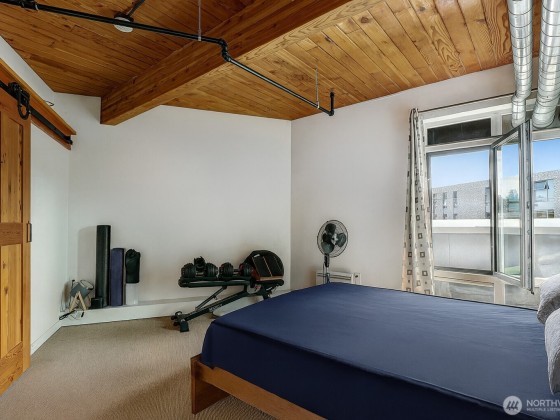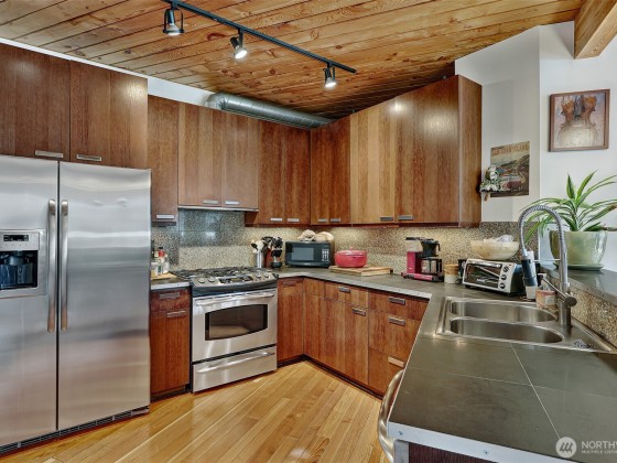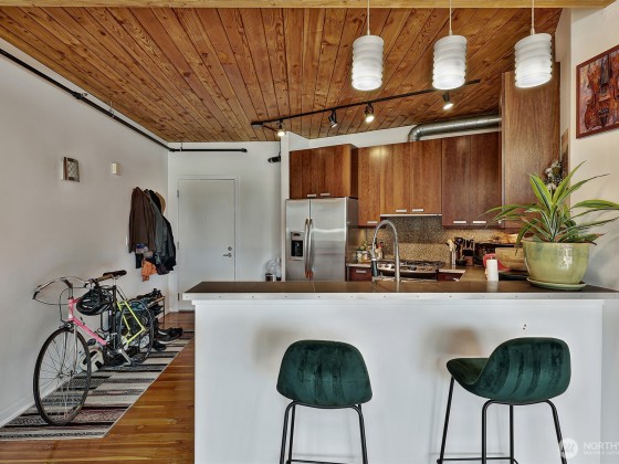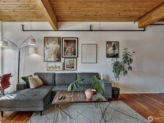 Modern finishes fashioned against an intriguing historical backdrop. Customized loft space set within a stunningly restored 1909 mercantile warehouse. Open floor plan w/every space maximized w/sliding barn doors & clever built-ins. Reclaimed fir hardwoods & exposed ceiling beams. Generous floor to ceiling windows in the living room with direct access to expansive south facing private deck w/territorial views. True one bedroom + generous closet. Garage parking space, steps away from all that Capitol Hill has to offer.