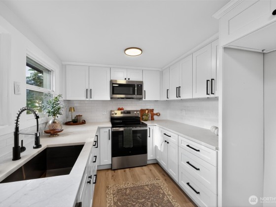 Beautifully remodeled North Tacoma Rambler just off Pearl Street and minutes from Point Ruston! This 3-bedroom, 1-bath home offers 966 sq ft of modern comfort with a brand-new kitchen, updated bath, new flooring, and trim along with interior exterior paint and roof. Enjoy stunning quartz countertops, stylish finishes, and a bright open layout that feels fresh and inviting. The large fully fenced backyard is perfect for entertaining, gardening, or play and also features a large outbuilding. Nestled in a quiet, highly desirable neighborhood within walking distance to parks, restaurants, and shops. Affordable, move-in ready, and ideal for first-time buyers wanting a true Tacoma lifestyle!