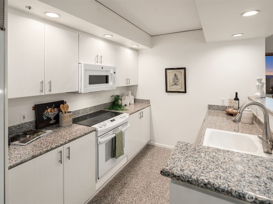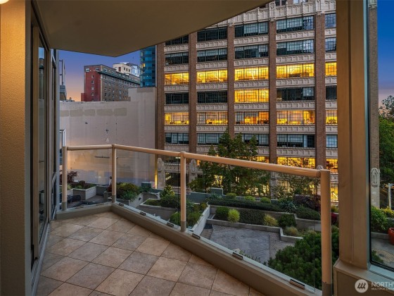 Best value available in Downtown Seattle! Spacious 1BR+DEN, which could double as a 2nd BR w/ its own bath. Steps to Pike Place & the revamped waterfront. This SW-facing home is drenched in natural light through oversized windows framing tranquil views of the garden terrace & protected views of Elliott Bay, visible from both main room & bedroom. Features incl. Central A/C, newly refinished patio, Sub-Zero fridge, granite kitchen counters/floors, fresh paint/carpet, limestone entry. Versatile den w/pocket doors doubles as guest room/flex space. Primary BR offers full en-suite bath + separate 3/4 bath for guests. Amenities: 24/7concierge, indoor pool/spa, gym, event room, view terrace. Garage parking. No rental cap & well-managed building!
