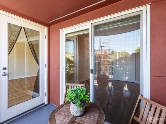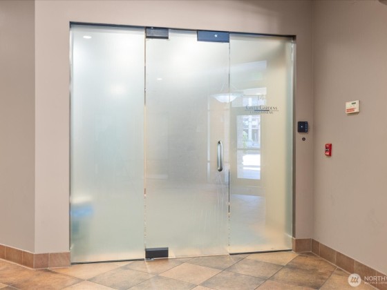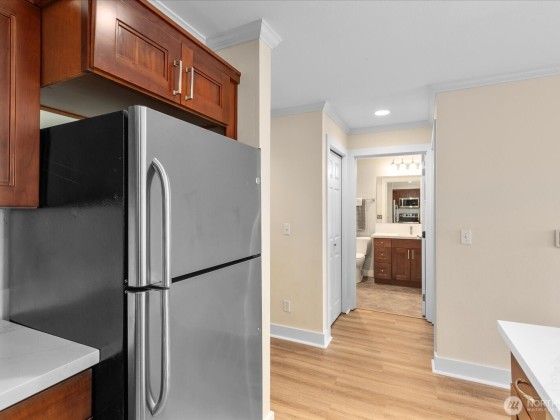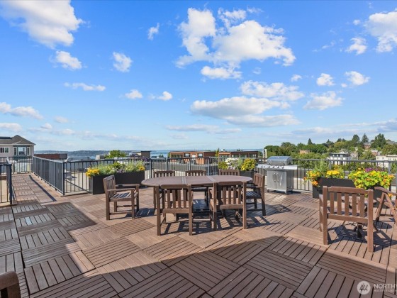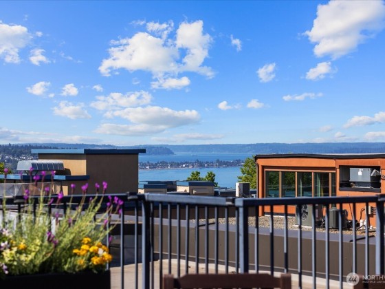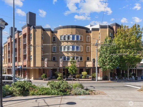 This light & bright condo is located in a prime, top of the hill, location & features a one bedroom PLUS office perfect for working from home. Kitchen features cherry wood cabinets with soft close (installed in '18) w/gorgeous quartz countertop & tile backsplash. Freshly installed luxury vinyl plank floors throughout the home. Office features additional oversized closet with built-in organizers for added storage. Wonderful balcony with mature plants for privacy & enjoying morning coffee. Bathroom updated in '18 with new vanity, countertop & sink. One assigned parking spot in secure garage, bike storage & storage unit complete this home. Don't miss the roof top deck w/stunning views of the Sound & Mtns. Walk to coffee, groceries & dining!