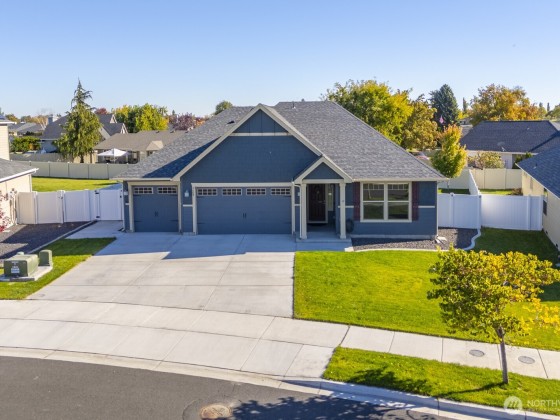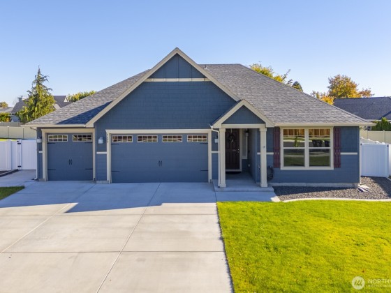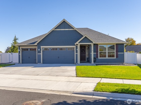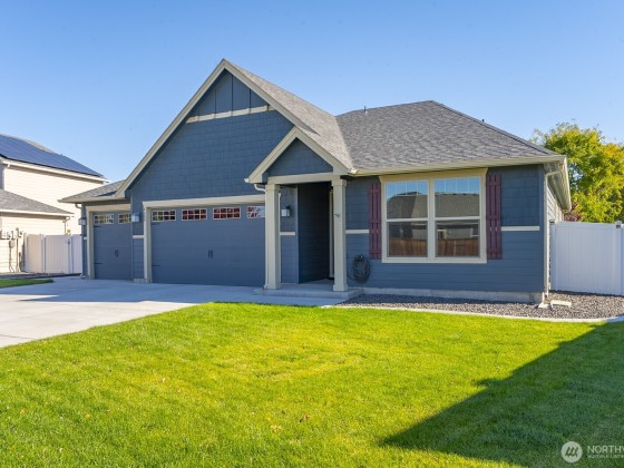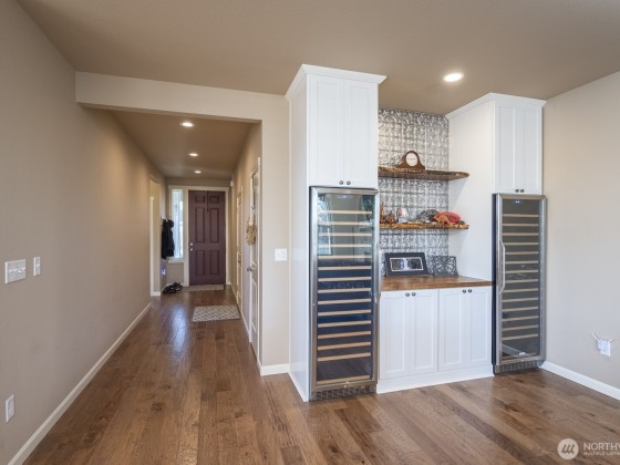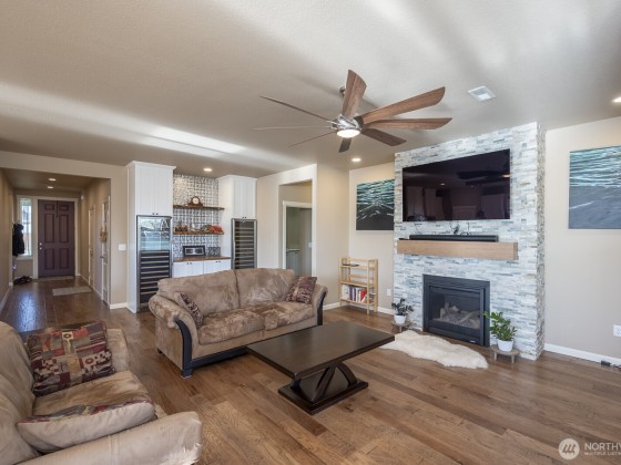 Step into this luxurious 2,059 square feet home featuring 9' ceilings & engineered hardwood flooring, this open-concept layout is perfect for modern living & entertaining. Custom wine bar w/ live edge shelving and 2 over-sized wine fridges. Massive kitchen island, quartz counter-tops, soft close cabinetry, and stainless steel appliances, including a gas range. Living space boasts a stunning stone gas fireplace & large windows letting in an abundant amount of natural light. The primary suite is a dream retreat with ceramic tile flooring, soaking tub, tile shower & a large walk-in closet. The exterior is a retreat of its own w/ patio extended the width of the home, 14' x 14' patio cover w/ ceiling fans, vinyl fencing, & manicured landscaping.