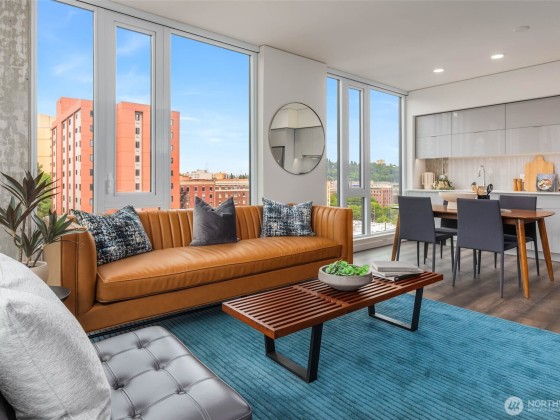 Welcome to KODA—a bold, modern high-rise in Seattle’s vibrant International District. Thoughtfully designed homes feature generously lofted floor-to-ceiling windows, smart layouts, and sleek finishes. This two bedroom, two bathroom + den home features wrap-around windows to maximize natural light to the flexible open-concept layout. Price includes one reserved parking spot, one storage unit. Enjoy unmatched amenities: a wellness center, rooftop terrace with sweeping views, coworking lounge, guest suites, and Club KODA with a theater, kitchen, and dining space. Steps from light rail, Uwajimaya, stadiums, and downtown, KODA blends urban energy with authentic cultural roots. Live where heritage meets modern living.