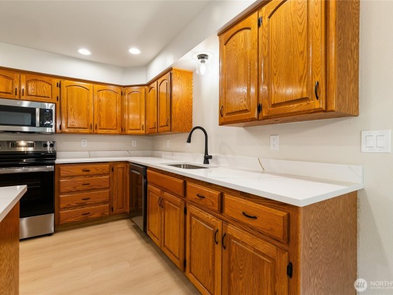 Beautifully remodeled 2-bedroom, 2-bath condo offering 1,749 sq. ft. of single-level living. Versatile den/office could serve as a 3rd bedroom. Lives and feels like a single-family home! Features include a 2-car garage, private patio with territorial views, and a spacious open-concept layout. Enjoy a stunning new large kitchen with quartz countertops, stainless appliances, and eat-in peninsula. All-new LVP flooring, carpet, and coordinated LED lighting throughout. The primary suite impresses with a large walk-in closet, dual vanity, and custom tile oversized tub surround. Prime Lynden location near schools and Edaleen—exceptional value!