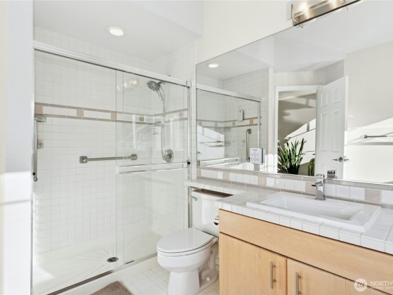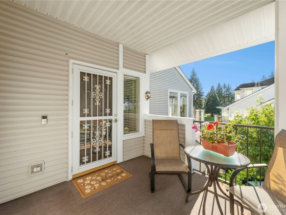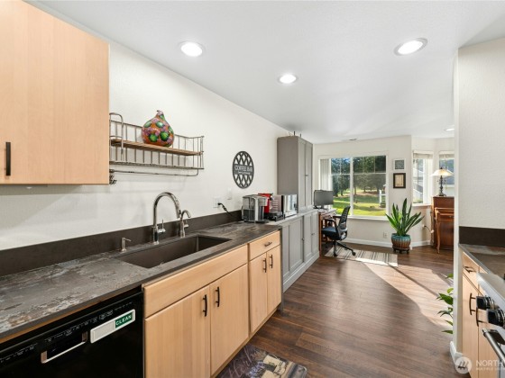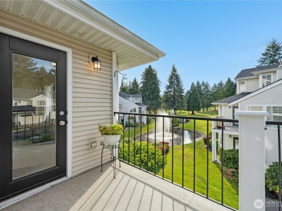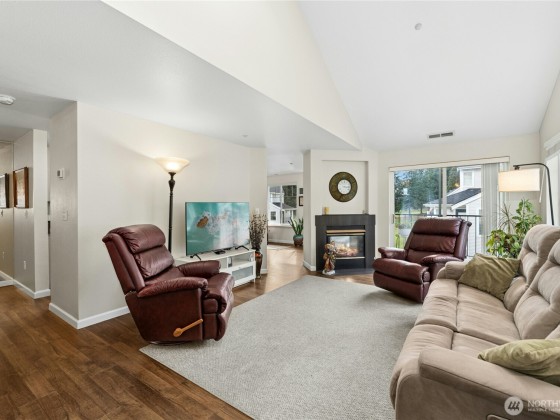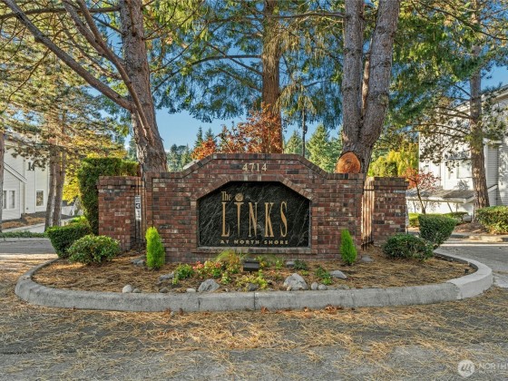 This bright and spacious 3-bed, 1.75-bath condo offers 1,676 sq ft of beautifully maintained living space. Vaulted ceilings with skylights and a cozy, double sided, gas fireplace create a warm, inviting living room. Sliders open to a private deck with peaceful fountain and golf course views. The sleek kitchen provides abundant cabinetry, and the dining area allows for formal dining. A versatile flex space off the kitchen can be used for an office or family room or informal dining . The primary suite features a dual-vanity ensuite and large walk-in closet. This desirable second-floor unit includes a welcoming front deck, 2-car garage with interior stairs, and guest parking. Convenient NE Tacoma location near I-5, parks, and local amenities.